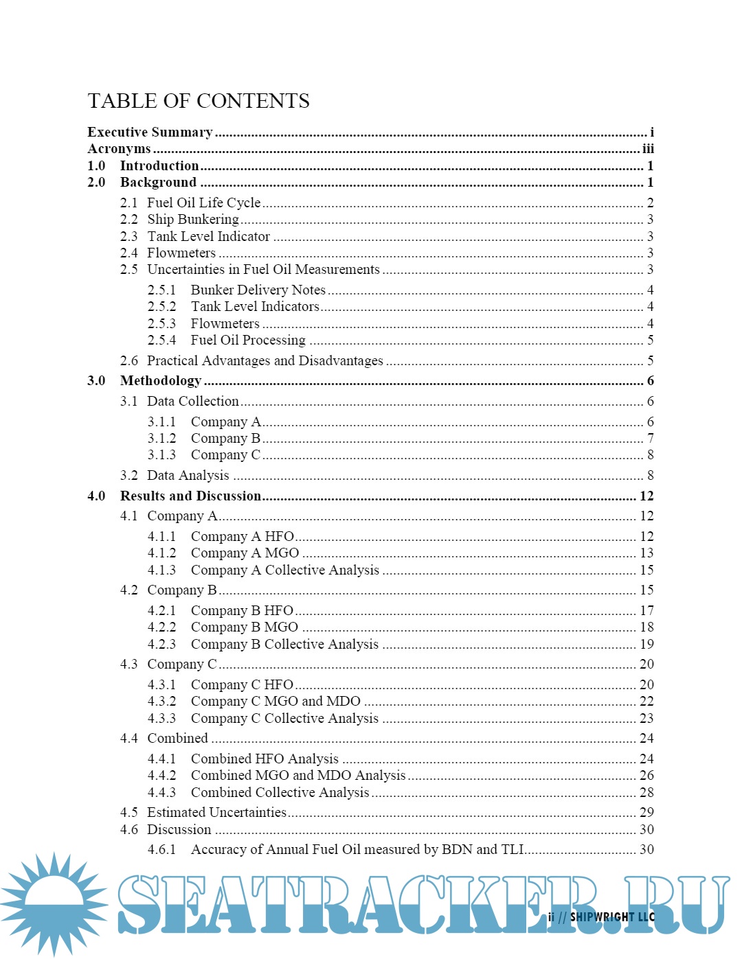 Year: 2018 Language: English Author: J. Travis Hunsucker, Dylan Przelomski, Alex Bashkoff, John Dixon Genre: Research papers Publisher: Shipwright LLC Format: PDF Quality: eBook Pages count: 99 Description: The International Maritime Organization (IMO) has been actively estimating the CO 2 emissions from shipping for over the past decade. The results have been published in the First, Second, and Third Greenhouse Gas Studies (IMO 2015). Amendments to MARPOL Annex VI entering into force on 1 March 2018 will require ships to submit annual fuel oil consumption data to the IMO. The three most widely used methods for collecting data on annual fuel oil consumption are the bunker delivery note (BDN), monitoring tank level indicators (TLI), and using flow metering. The IMO convened this study to examine the uncertainty for each of these methods. The study estimated the uncertainty for each of these methods using 550,000 tonnes of measured fuel oil consumption from approximately 46 ships owned or operated by three companies. Key Findings 1. Annual fuel oil consumption determined from BDN and TLI data were in close agreement; whereas, the values determined from flowmeter data were systematically lower with the differences larger than what can be reasonably associated with fuel oil processing. The relatively large variance of the flowmeter data when compared to the BDN and TLI data suggest that the flowmeter data contain considerable amounts of random error. 2. An uncertainty analysis at a 95% confidence interval estimated that for all of shipping, the annual HFO fuel consumption determined from TLI and flowmeter data would have the following differences when compared to BDN data. • TLI: 0.33% ± 1.8% • Flowmeter: -12% ± 6.5% It is unknown if the relatively poor agreement of the flowmeter data in comparison to BDN and TLI sources are a coincidental artifact unique to these companies or if these findings are emblematic of accuracy problems observed in other types of shipboard data. 3. Combining the results with the literature survey for this study, the overall uncertainty for each of the fuel oil measurement methods was estimated as follows: • BDN: 3% for HFO and MGO/MDO • TLI: 5% for HFO and MGO/MDO • Flowmeter: 8% for HFO and 10% for MGO/MDO