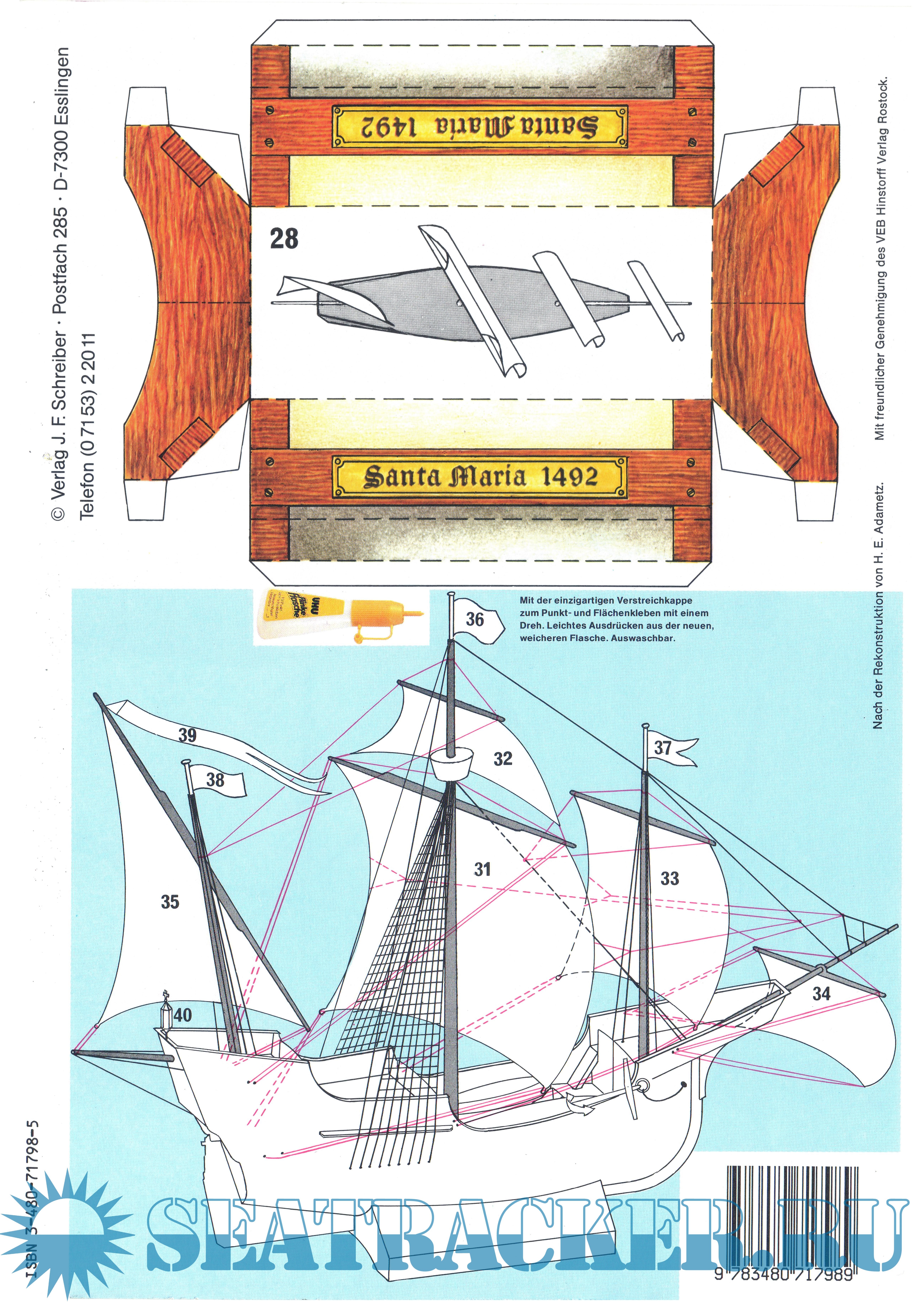Год выпуска: 2009 Язык: Мультиязычный Автор: Hubert Siegmund Жанр: Другое Издательство: Schreiber-Bogen Формат: JPEG Качество: Изначально компьютерное (eBook) Количество страниц: 15 Описание: 15 листов цветных выкроек и инструкций для изготовления бумажной модели флагманского парусного корабля Колумба ''Santa Maria'' 1492 год в масштабе 1:100