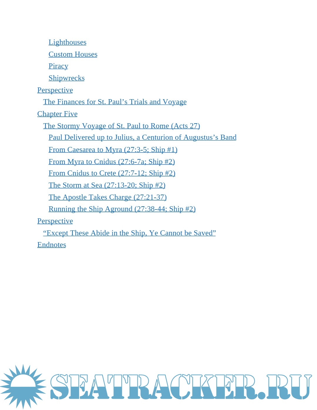 Travel by sea had many dangers in the early centuries of the empire, and the stormy voyage and shipwreck of the Apostle Paul as recorded in Acts 27 is examined in the final chapter. It is universally acknowledged and “may be safely asserted, that no historical description of a long voyage and shipwreck has come down to us from ancient times, so circumstantial, accurate, and natural in its details as that which is contained in this remarkable chapter.”