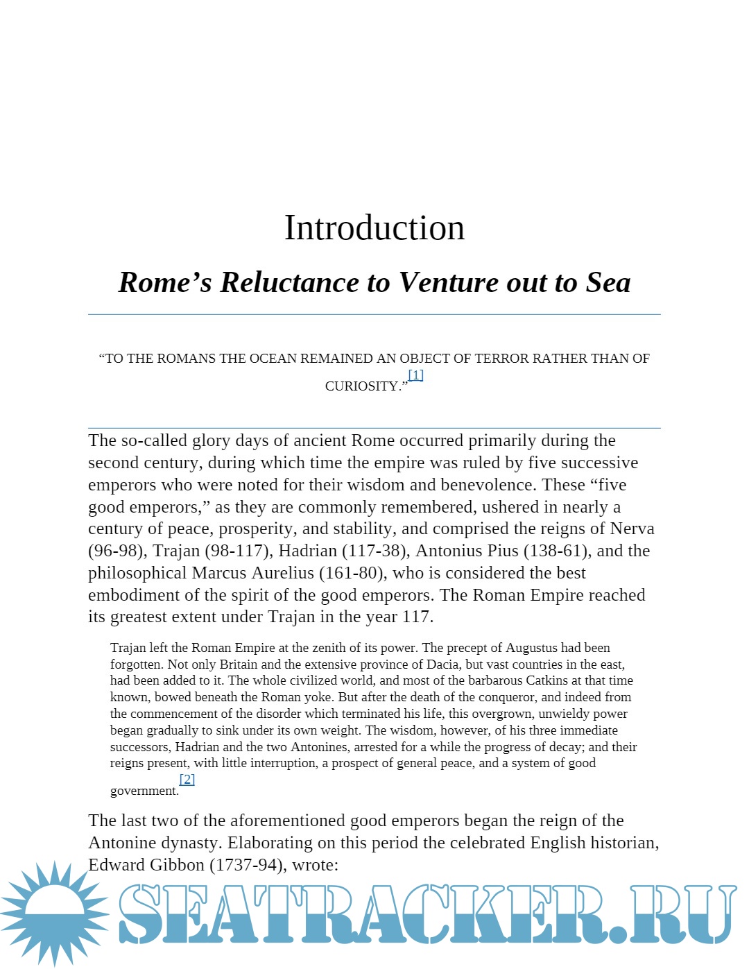 Description: The ancient Romans were primarily a land-based people, and for them “the ocean remained an object of terror rather than of curiosity.” As Edward Gibbon noted, “Unlike the Phoenicians and Carthaginians, the Romans had no inclination to expeditions of mere discovery, and never cared to become acquainted with any country whose remote situation appeared to defy their arms. Vain of their own power and of the extent of their dominions, they did not hesitate, in almost every instance, to bestow the name of barbarians on the civilized inhabitants of India as well as on those of other parts of the world, whose manners or customs were indistinctly known to them. Despising commercial pursuits, they looked to Greece and other nations to regulate their over-sea trade and to supply their wants; and when their fleets obtained the dominion of the sea, their object was less to protect their rapidly extending maritime commerce than to consolidate and preserve their power and dominion upon the land.”