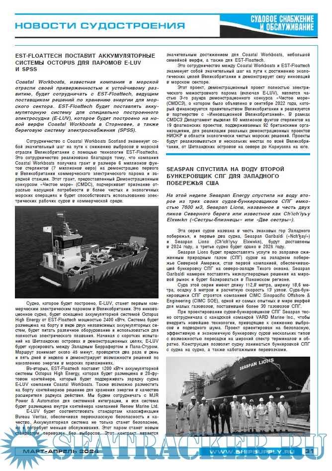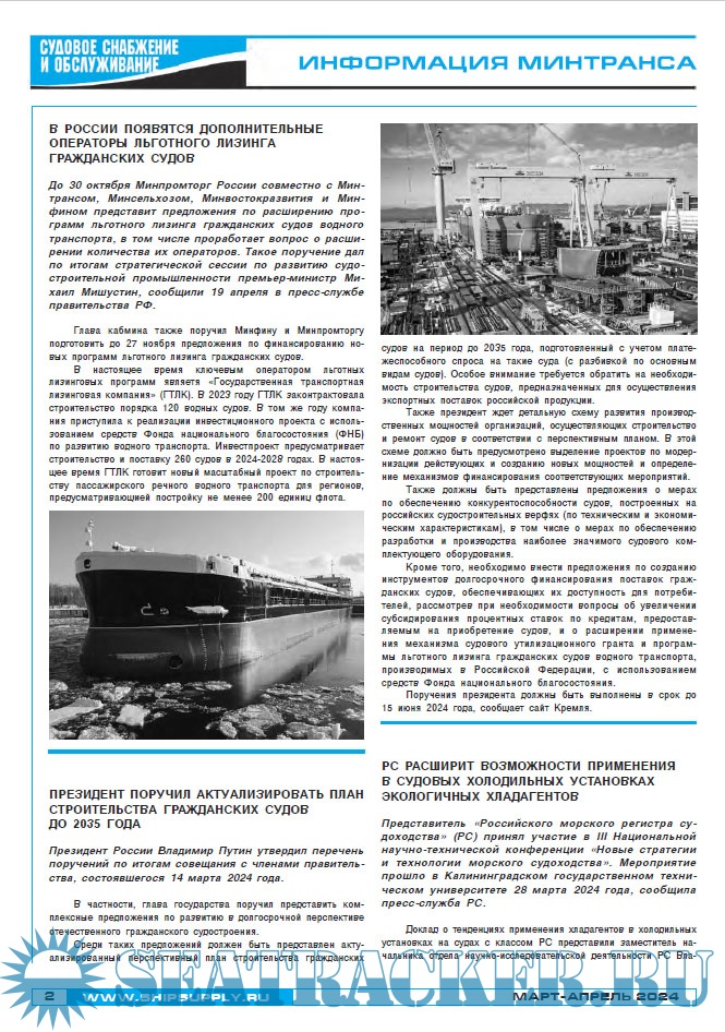 Год выпуска: 2024 Язык: Русский Автор: группа авторов Жанр: Периодическое издание (журнал) Издание: 2024-2 Формат: PDF Качество: Изначально компьютерное (eBook) Количество страниц: 56 Описание: ''Судовое снабжение и обслуживание'' периодический информационный бюллетень, издается с 1999 года и в настоящее время по праву занимает одно из ведущих мест среди специализированных отраслевых печатных изданий.Бюллетень стал надежным маркетинговым инструментом для технического менеджмента судостроительных, судоремонтных и снабженческих компаний. Более 500 отечественных и зарубежных фирм рекламодателей успешно сотрудничают с журналом с целью расширения своего бизнеса.Бесспорным преимуществом является бесплатное распространение издания целевой адресной рассылкой: судостроительным и судоремонтным предприятиям; морским и речным портам; судовладельцам морского, речного, промыслового флота; производителям и поставщикам судового оборудования, снабжения и материалов; предприятиям обслуживания флота (всего более 9000 компаний РФ). В журнале представлен весь спектр судового оборудования, комплектующих, запчастей, снабжения и материалов (с указанием контактных данных фирм производителей и поставщиков).
