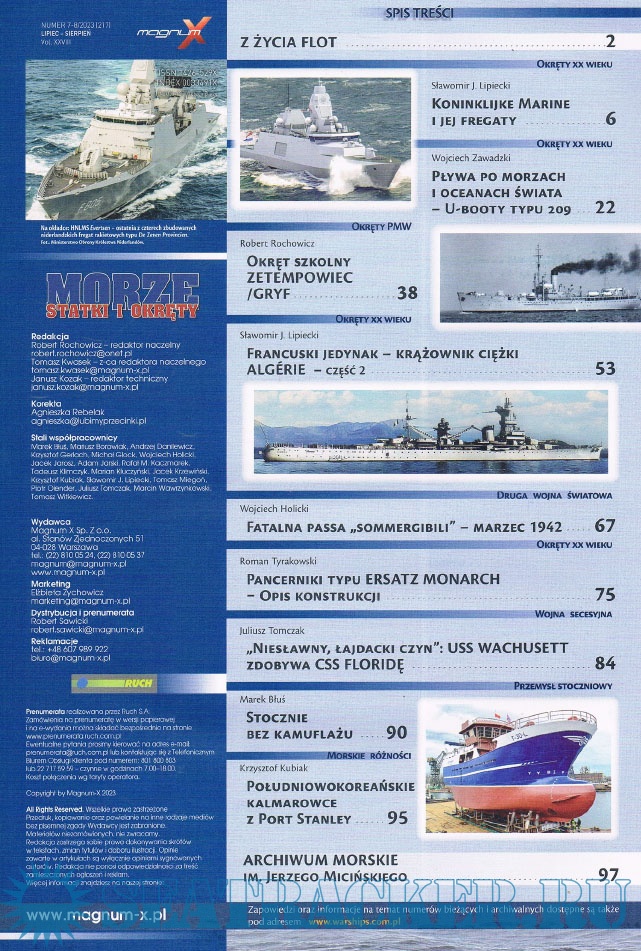 Description: Польский морской журнал. Издается с 1996 года, первоначально как ежеквартальный. С 1999 года издается раз в два месяца, а с 2007 года-как ежемесячный. Первоначально назывался Morza Statki i Okrety, в 2006 году переименован в Morze Statki i Okrety. С 2004 года полностью цветной (ранее только вставки). В 2008 году стали издаваться специальные выпуски, первоначально нерегулярные. С 2014 года выпускается как обычное издание и специальное издание, с непрерывной нумерацией.