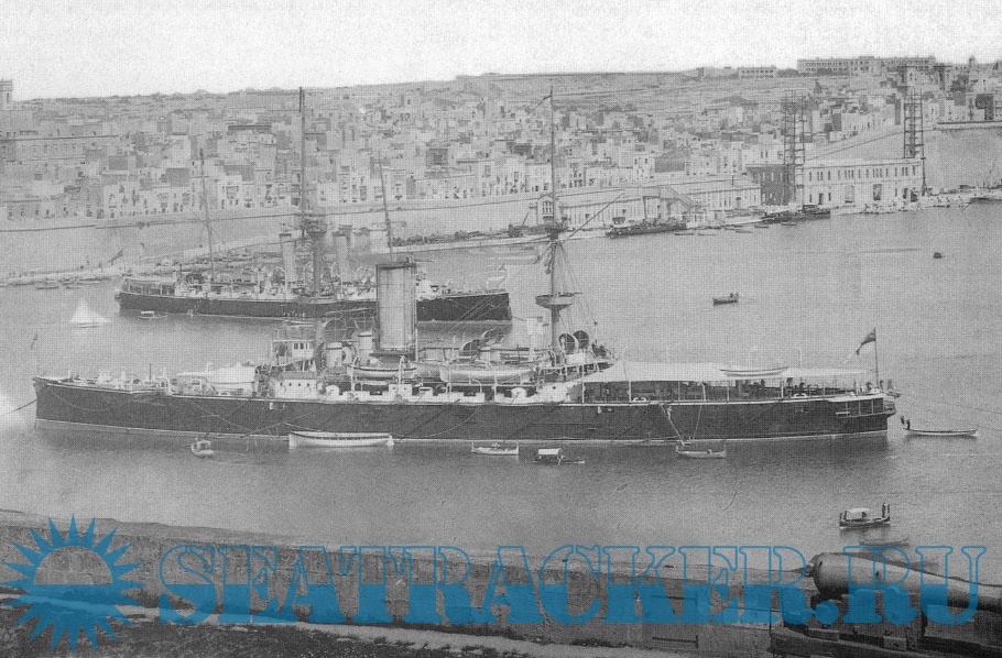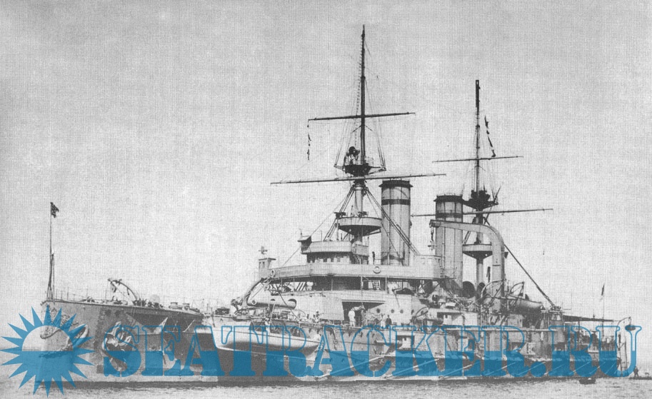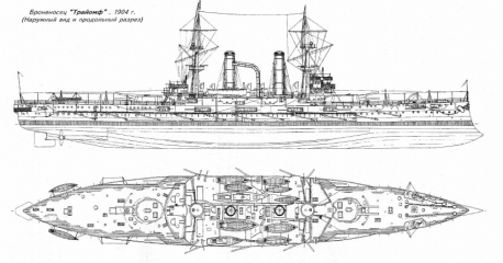 Описание: "В шести милях на SO от Габа-Тепе, оставаясь на ходу, держался на своей позиции "Трайомф". Сети были опущены, все водонепроницаемые двери задраены, прислуга противоминной артиллерии стояла у орудий. Миноносец "Челмерс" 15-узловым ходом кружился вокруг. В 12 ч 25 мин, в тот момент, когда "Челмерс" огибал форштевень "Трайомфа", он заметил на правом его тра-верзе подозрительную белую полоску.
