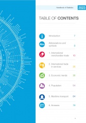 Description: The UNCTAD Handbook of Statistics 2023 provides a wide range of statistics and indicators relevant to the analysis of international trade, economy, investment, maritime transport, and development overall. In these uncertain times, reliable statistical information becomes even more indispensable for effective policy responses and decisions, aiding countries to recover from different crises and build a more just, inclusive, and sustainable economy. The UNCTAD Handbook of Statistics and the UNCTADstat Data Centre make internationally comparable data sets available to policymakers, specialists, researchers, ofcials of nationa l Governments, representatives of internationa l organizations, journalists, academia, the private sector, and experts of non-governmenta l organizations. In addition, these statistics underpin all UNCTAD activities. Whether for research, policy advice or technical cooperation, UNCTAD needs reliable and internationally comparable trade, nancia l and macroeconomic data with global coverage, spanning severa l decades. The 2022 data show continued growth of the economy after the COVID-19 pandemic for gross domestic product (GDP) and international trade. Growth of rea l GDP was 3.1 per cent after an unusually high growth of 5.9 per cent in 2021. A strong boost made international merchandise trade exceed by far its pre-pandemic levels already in 2021, with a continued increase in 2022, albeit at a reduced pace. The growth of trade in services was more moderate than in merchandise trade, leading it to exceed pre-pandemic levels only in 2022. This was primarily driven by a strong recovery of international travel. Digitally deliverable services, on the other hand, saw a notable expansion amid the pandemic, in 2021, with a moderate growth of 3 per cent in 2022. According to UNCTAD’s nowcast, the growth of internationa l trade and economic output is losing momentum in 2023. Real GDP growth is nowcast to slow down to 2.2 per cent, and growth in services trade to 7.0 per cent in 2023. According to the rst statistics, international merchandise trade decreased by 4.6 per cent in the rst half of 2023, year over year. UNCTAD nowcast indicates a continued decline for the third and fourth quarters of 2023, year on year. The 2023 nowcasts on global trade and GDP included in this handbook are updated weekly in a dedicated dashboard on UNCTADstat, which allows tracking the development of the nowcast outcomes and their drivers in almost real time; see https://unctadstat.unctad.org/EN/Nowcasts.html. This year again, the online edition of the handbook, the e-handbook, incorporates interactive charts and maps at: https://hbs.unctad.org/