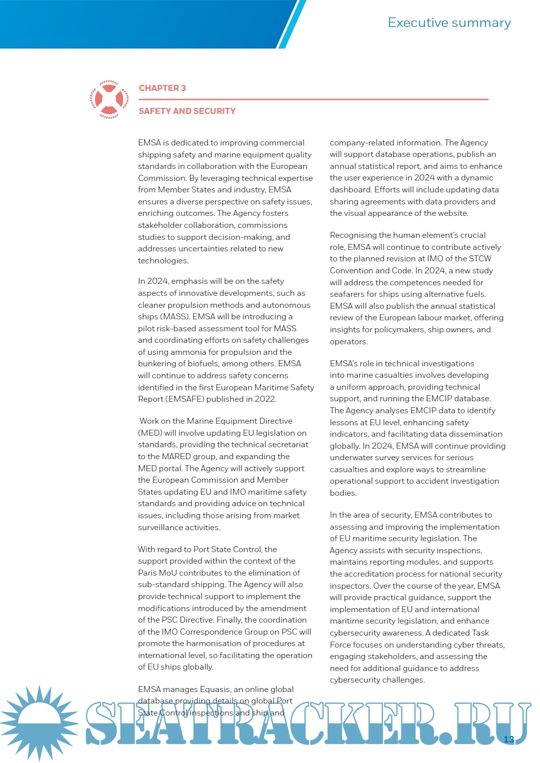 Description: The EMSA Outlook 2024 outlines the Agency’s strategic priorities for the upcoming year. Aligned with the overarching multi-annual strategic goals, these key focus areas are derived from the officially endorsed Single Programming Document (2024-2026), a robust roadmap adopted by EMSA’s Administrative Board in November 2023. Structured around seven thematic categories, this publication places a strong emphasis on Sustainability, Safety & Security, Surveillance, and Simplification, reinforcing the Agency’s commitment to addressing the associated fundamental maritime challenges. Complementing these core areas, is the Agency’s focus on three cross-cutting themes – Digitalisation, Technical Assistance and Strategic Support. This strategic framework steers EMSA’s operational initiatives and serves as the structure for this publication. Each chapter provides a comprehensive overview of the Agency’s efforts within these domains. Below, we offer a preview of some noteworthy highlights for the year ahead.