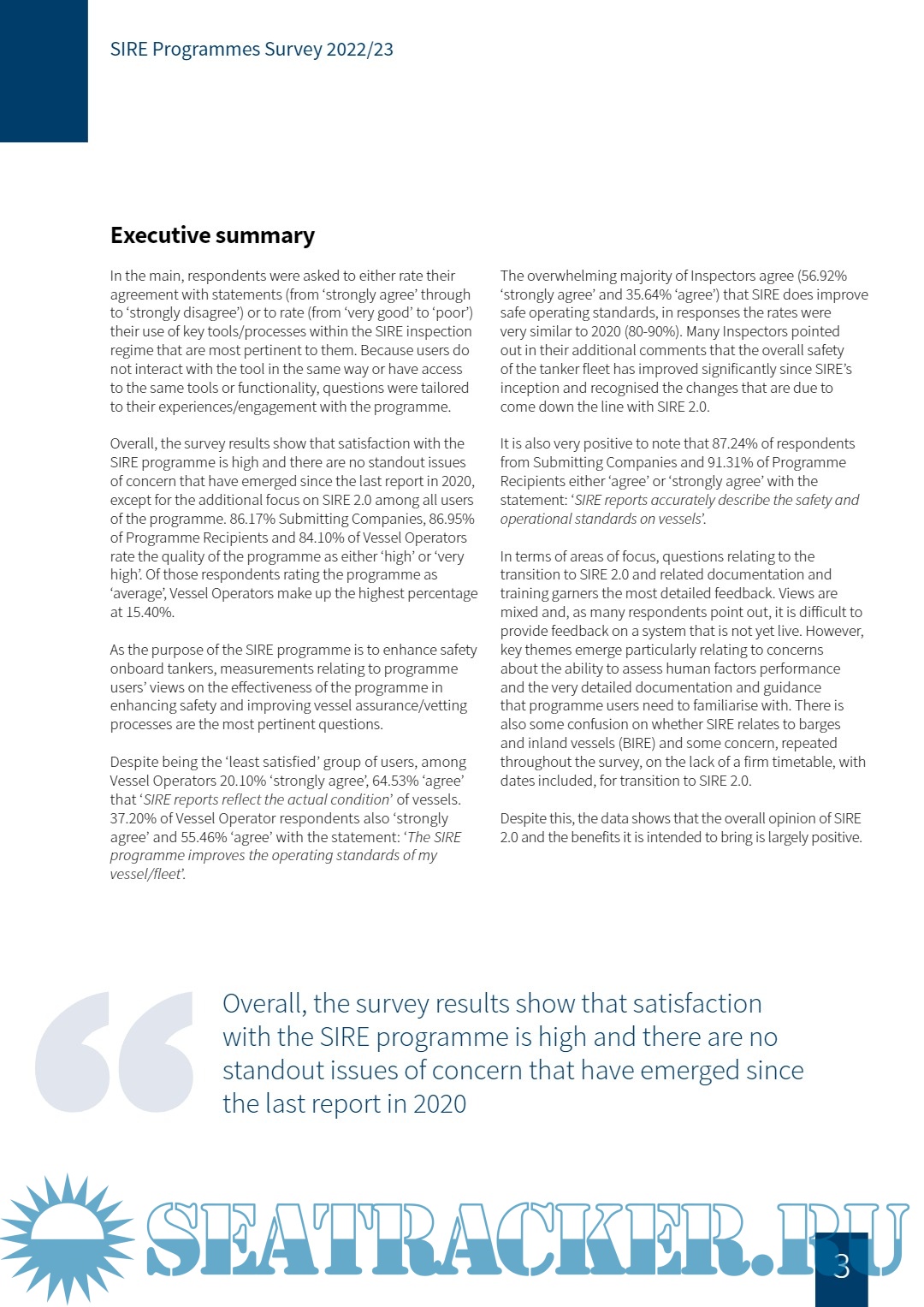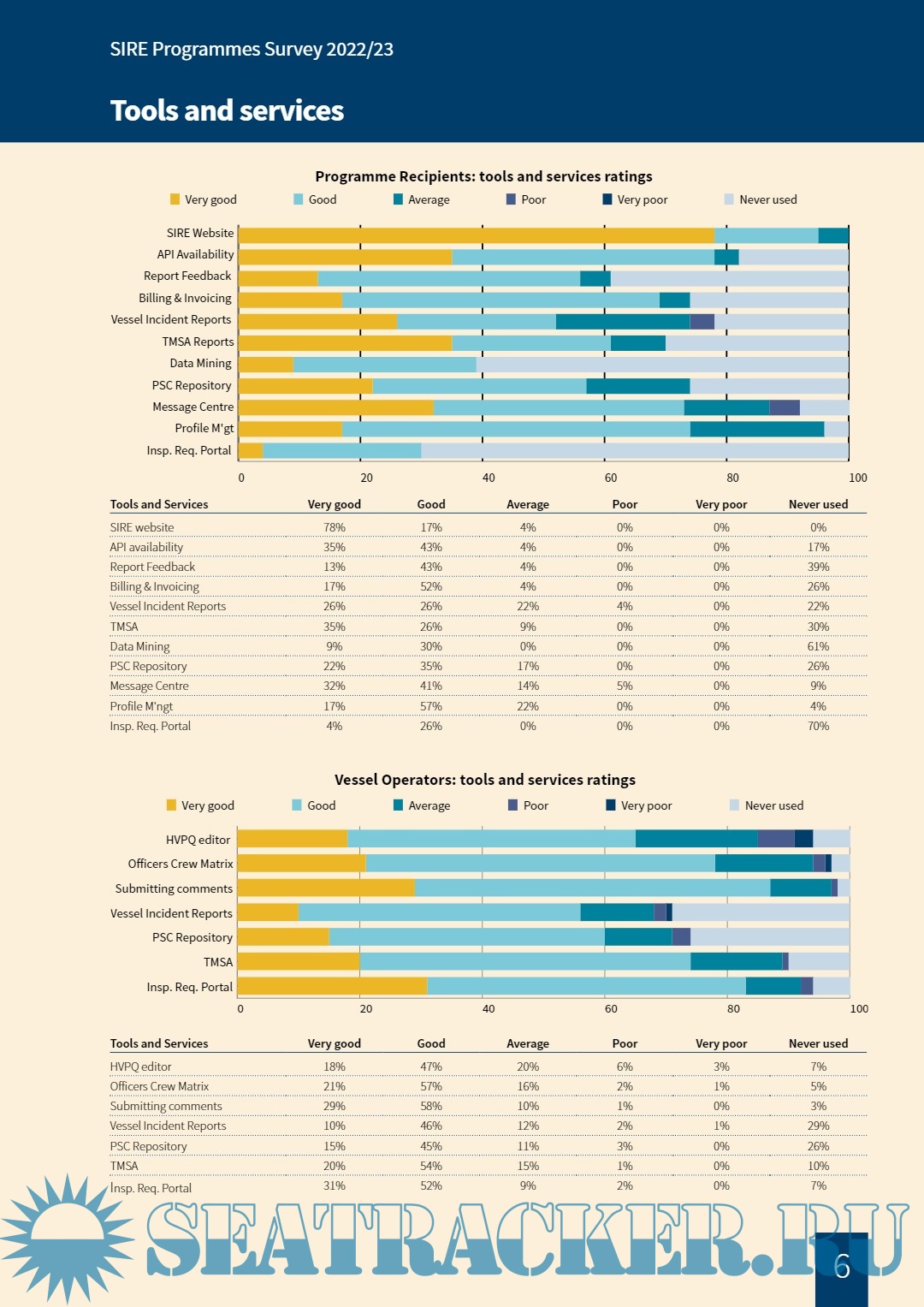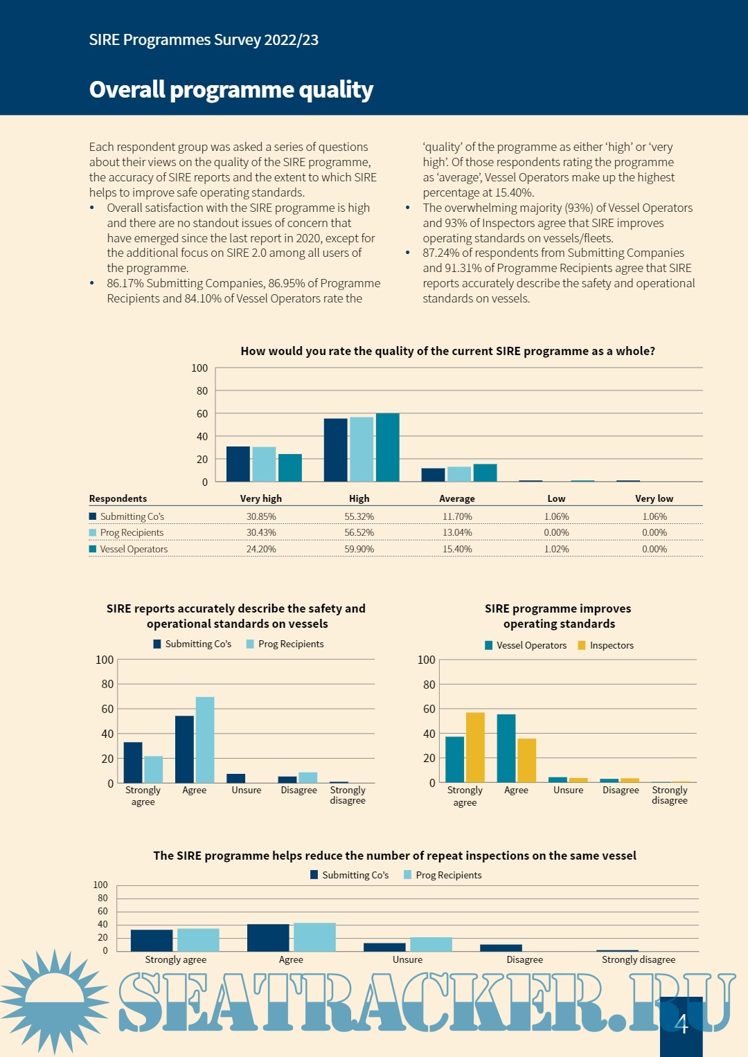 The four SIRE programme user groups – submitting companies, Programme Recipients, Vessel Operators and Inspectors – have been surveyed about the aspects of the programme that apply to their use and interaction with the inspection regime. Research methodology The research was conducted by a third-party communications and research agency on behalf of OCIMF. The research and analysis has been conducted in accordance with the Market Research Society (MRS) Code of Conduct on respondent anonymity and under the rules of the Data Protection Act. As the use of the programme differs for each programme user group, a unique survey was created for each one. This means four separate surveys were conducted for SIRE programme users. Where appropriate, questions were replicated across respondent groups for the purposes of comparison against each other and with the previous survey (conducted in 2020). The surveys, completed anonymously, are quantitative, with options for providing additional written comment for each question. The survey links were distributed by OCIMF through the SIRE Portal in December 2022 and closed for responses eight (8) weeks later, in February 2023.