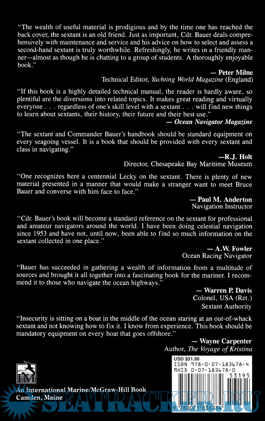 Description: Loran and GPS notwithstanding, there will always be a place for the sextant aboard any blue-water boat, if for no other reason than the thrill and mystery of finding one's position on earth by gazing at the heavens. Here is the indispensable reference that should accompany the instrument aboard. Cmdr. Bruce Bauer, a professional navigator and master mariner with the U.S. Merchant Marine, has distilled years of hands-on experience into an eminently readable guide to buying, adjusting, using, and repairing sextants.