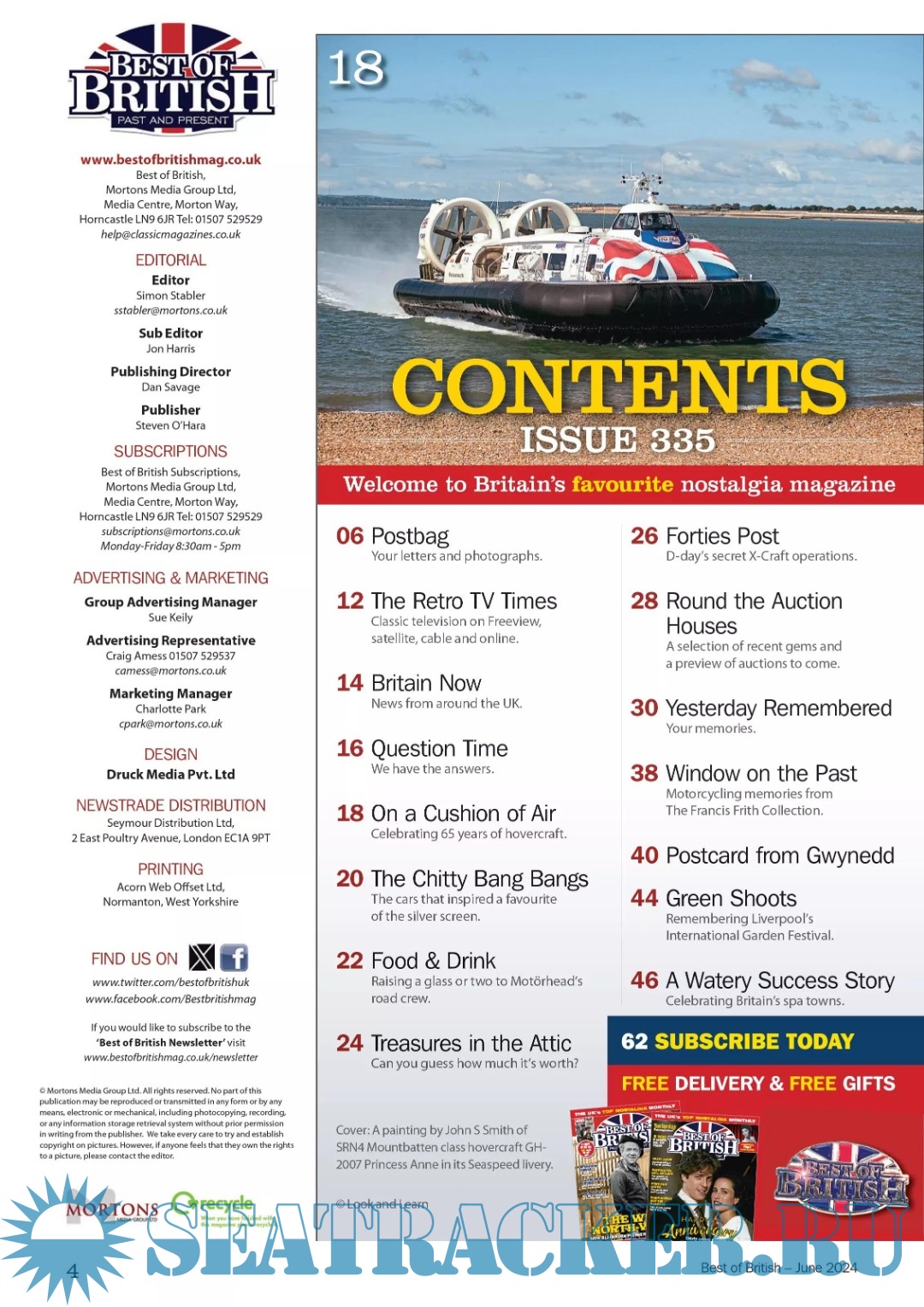 Year: 2024 Language: English Author: Simon Stabler Genre: Periodical (magazine) Publisher: Mortons Media Group Ltd. Format: PDF Quality: eBook Pages count: 76 Description: The UK's top nostalgia monthly. Every issue of Best of British magazine is packed with features that celebrate classic entertainment, transport, food and drink, and the great British countryside. Also included in the new June issue… On a Cushion of Air Celebrating 65 years of hovercraft.
