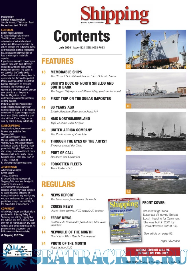 Description: Shipping T&Y is a monthly magazine for the shipping enthusiast offering up-to-date information, topical and in-depth historical articles alongside images, many of which are exclusive to the magazine.Shipping Today & Yesterday is a specialist magazine for the shipping enthusiast offering up-to-date information, topical and in-depth historical articles.Shipping Today & Yesterday was first produced in March 1990 by, the then Editor and Publisher, John Young. The first edition stated that it would, “offer a news service covering important developments in the Shipping industry Today and will look back at ships and events of Yesterday, with regular features on merchant ships