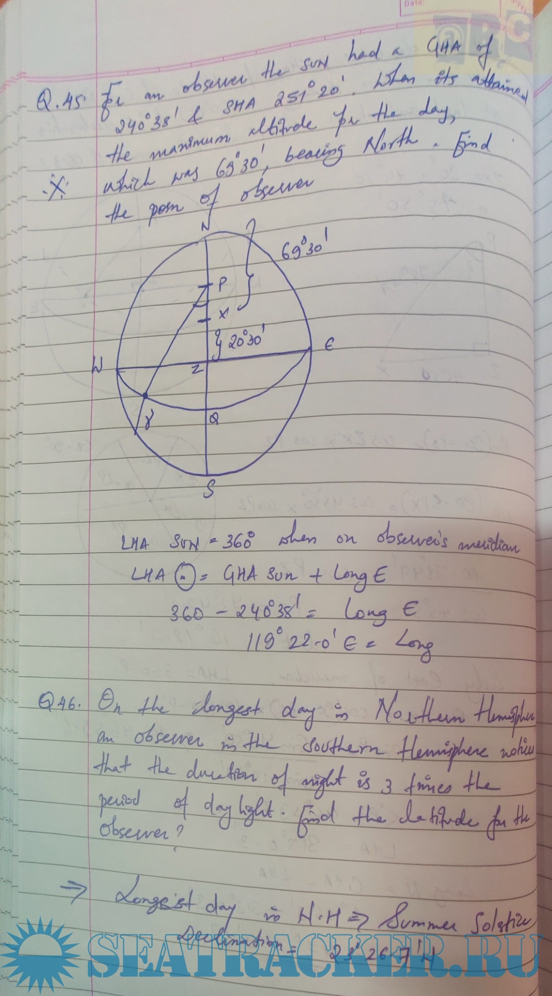 Solutions for Celestial Navigation Part B Numericals for Mercantile Marine Department (MMD), India Examinations for Phase I (Chief Mate F.G.)