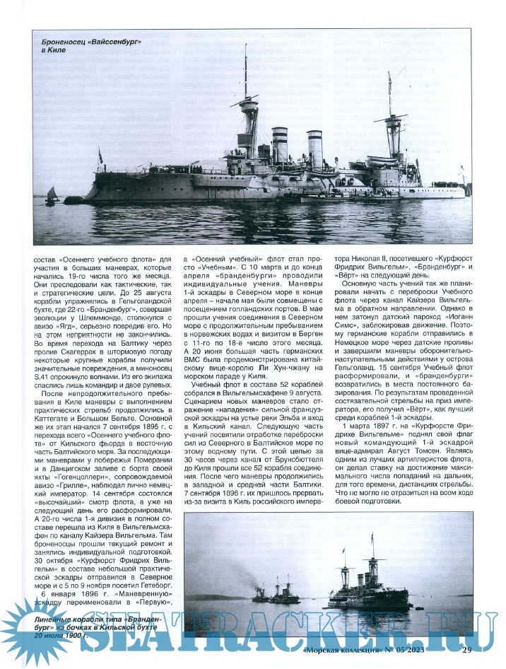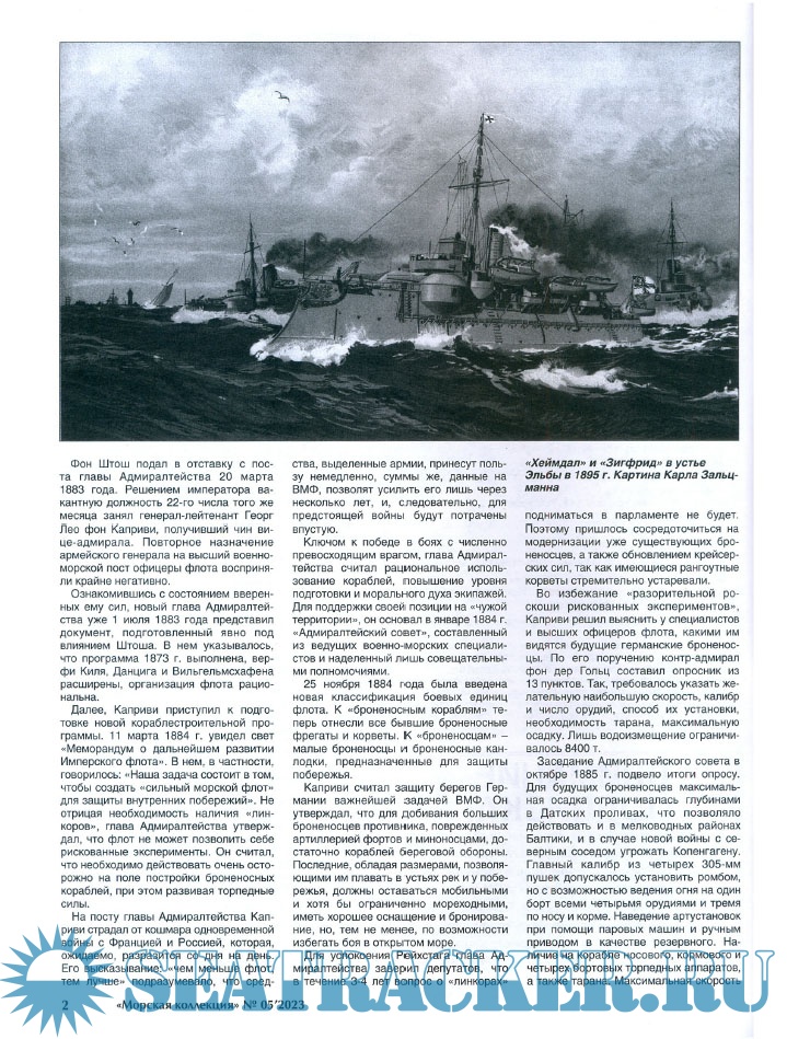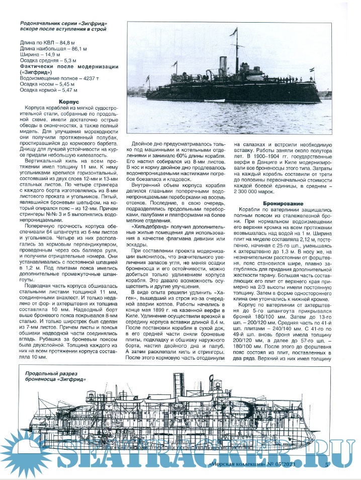 Описание: Выпуск является логическим продолжением `Морской коллекции` №3 (`Броненосцы Северогерманского союза`) и №6 (`Броненосцы Германской империи от `Пройсена` до `Ольденбурга`) за 2022 го. Он повествует о двух типах германских броненосцев, пополнивших Кайзерлихмарине в первой половине 1890-х год.