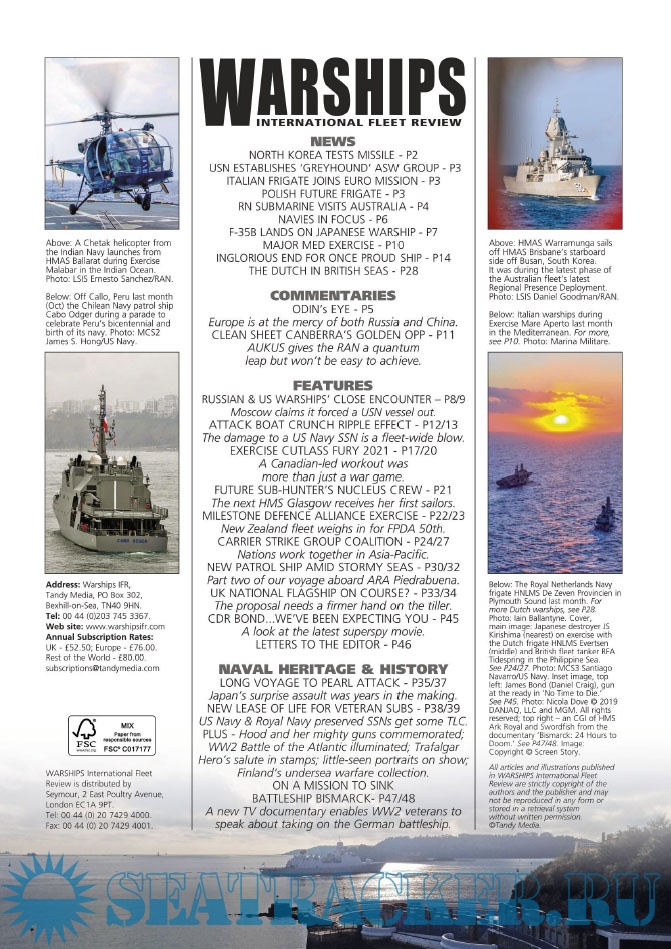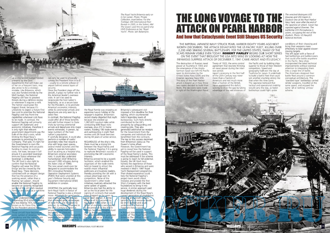 Description: Warships IFR puts the spotlight on the latest developments in the world’s navies. It covers current defence issues and has comments by leading analysts. The magazine regularly includes features on the Royal Navy and the US Navy in addition to incorporating news and features on all other navies across the globe. Warships IFR frequently carries in-depth articles on naval heritage.WARSHIPS International Fleet Review is published 12 times a year by Tandy Media Ltd who also publish Shipping Today & Yesterday (which provides news and features from the world of merchant shipping).