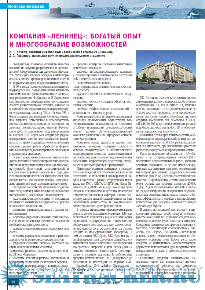 Год выпуска: 2017 Язык: Русский Автор: группа авторов Жанр: Периодическое издание (журнал) Издательство: Зеркало Петербурга Формат: PDF Качество: Изначально компьютерное (eBook) Количество страниц: 40 Описание: В северной столице проводятся фундаментальные исследования и создаются перспективные образцы военной техники и вооружения. Важнейшая роль Петербурга в российском кораблестроении и оборонно-промышленном комплексе придают особый статус Международному военно-морскому салону. Он проводится с 2003 года и стал одним из наиболее ярких событий в деловом календаре Петербурга, снискал репутацию одного из самых престижных форумов мирового морского сообщества.