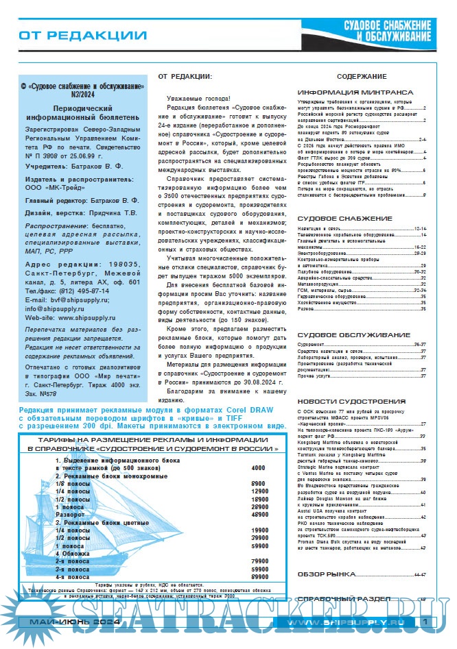 Описание: ''Судовое снабжение и обслуживание'' периодический информационный бюллетень, издается с 1999 года и в настоящее время по праву занимает одно из ведущих мест среди специализированных отраслевых печатных изданий.Бюллетень стал надежным маркетинговым инструментом для технического менеджмента судостроительных, судоремонтных и снабженческих компаний. Более 500 отечественных и зарубежных фирм рекламодателей успешно сотрудничают с журналом с целью расширения своего бизнеса.Бесспорным преимуществом является бесплатное распространение издания целевой адресной рассылкой: судостроительным и судоремонтным предприятиям; морским и речным портам; судовладельцам морского, речного, промыслового флота; производителям и поставщикам судового оборудования, снабжения и материалов; предприятиям обслуживания флота (всего более 9000 компаний РФ). В журнале представлен весь спектр судового оборудования, комплектующих, запчастей, снабжения и материалов (с указанием контактных данных фирм производителей и поставщиков).