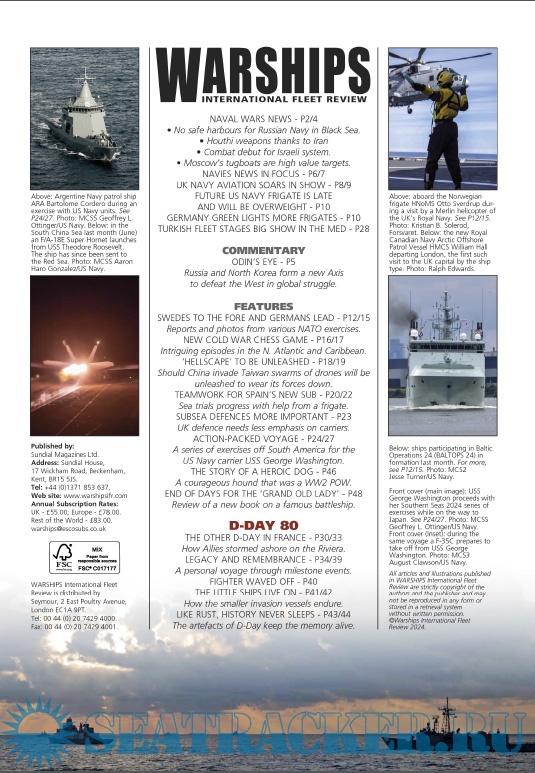 Description: Warships IFR puts the spotlight on the latest developments in the world’s navies. It covers current defence issues and has comments by leading analysts. The magazine regularly includes features on the Royal Navy and the US Navy in addition to incorporating news and features on all other navies across the globe. Warships IFR frequently carries in-depth articles on naval heritage.WARSHIPS International Fleet Review is published 12 times a year by Tandy Media Ltd who also publish Shipping Today & Yesterday (which provides news and features from the world of merchant shipping).