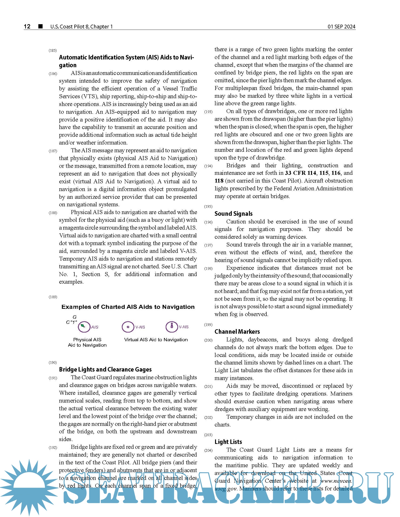 Topics in the Coast Pilot include channel descriptions, anchorages, bridge and cable clearances, currents, tide and water levels, prominent features, pilotage, towage, weather, ice conditions, wharf descriptions, dangers, routes, traffic separation schemes, small-craft facilities, and Federal regulations applicable to navigation.