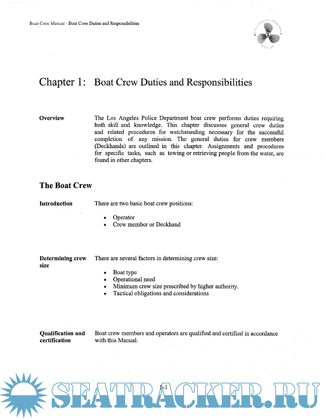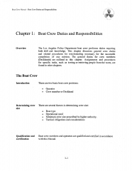 Description: The Los Angeles Police Department boat crew performs duties requiring both skill and knowledge. This chapter discusses general crew duties and related procedures for watchstanding necessary for the successful completion of any mission. The general duties for crew members (Deckhands) are outlined in this chapter. Assignments and procedures for specific tasks, such as towing or retrieving people from the water,are found in other chapters.