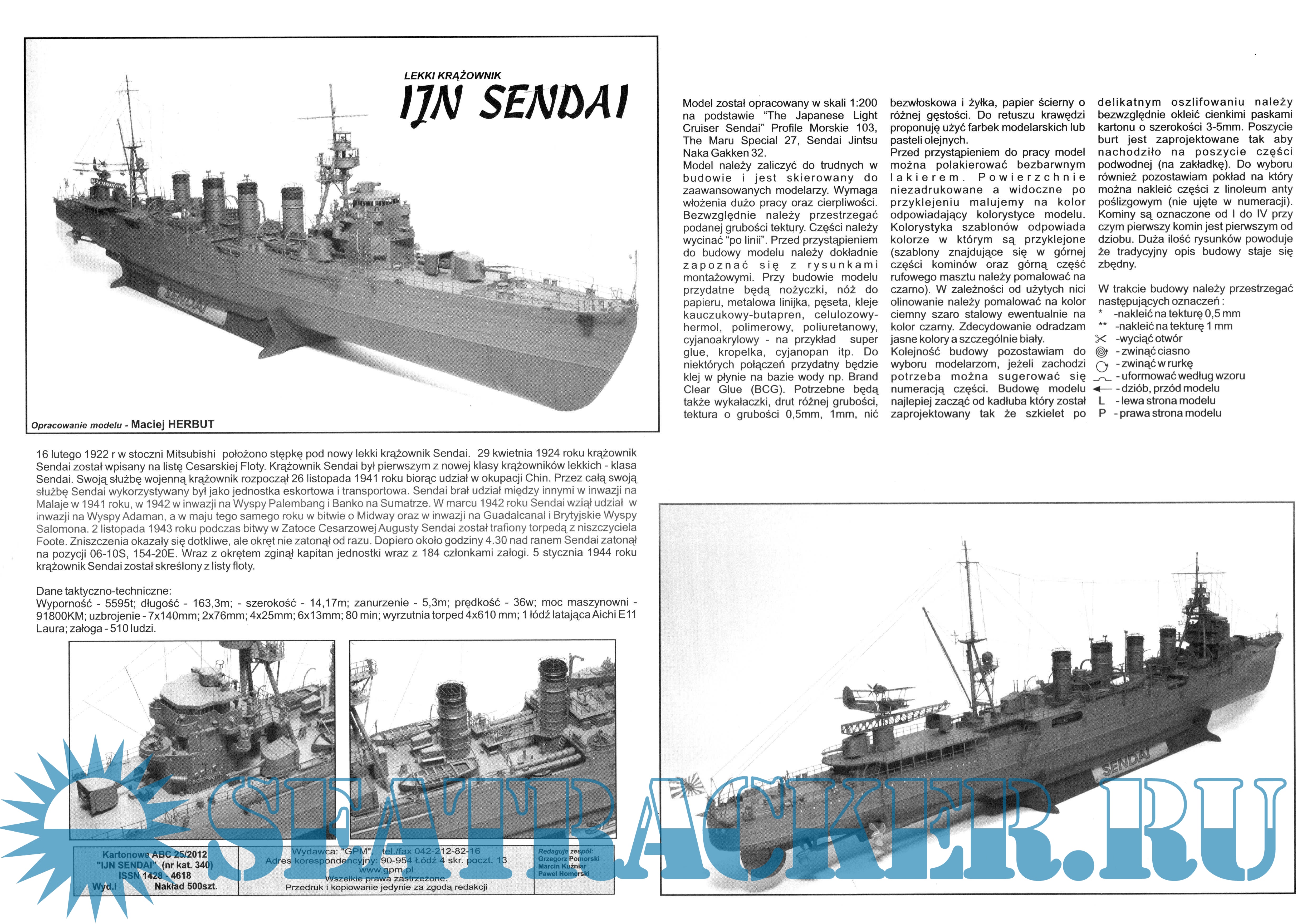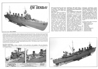 Описание: 25 листов цветных выкроек и инструкций для изготовления бумажной модели японского лёгкого крейсера IJN Sendai в масштабе 1:100