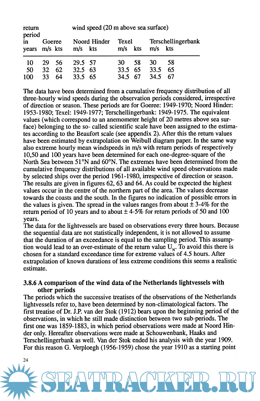 Description: The need for climatological data of the North Sea has increased during the past years. The increase in offshore and recreational activities can benefit greatly from such data. In order to meet this need weather observations made by ships and lightvessels in the North Sea have been processed extensively, which has resulted in a large number of tables, charts, etc. with climatological data. This publication gives a selection of these data, in which the emphasis lies on wind and wave data. In addition, some characteristic data on air and sea tempera ture, cloud cover, precipitation, visibility and sea level pressure are given. With regard to the observations of the lightvessels the publication can be consi dered as a continuation of earlier work. It also concludes the era of observations made by crew on board lightvessels, which gradually ended in the 1970's. The observations on fixed platforms which are now replacing the observations of the lightvessels are of a quite different character. The data are based on observations made on board lightvessels during the period 0 1949 -1980 and voluntary observing ships in the area between 51 ON and 60 N during the period 1961-1980. The observations of the lightvessels have been compared with those published for earlier periods (1859 -1883, 1884 -1909 and 1910 -1940). The manuscript (or part of it) has been critically examined by Prof.Dr.Ir. J.A. Battjes, E. Bouws, Dr.Ir. J.A. Buishand, H.A.M. Geurts, Dr. GJ.Komen, Dr. G.P.