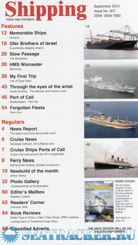 Description: Shipping T&Y is a monthly magazine for the shipping enthusiast offering up-to-date information, topical and in-depth historical articles alongside images, many of which are exclusive to the magazine.Shipping Today & Yesterday is a specialist magazine for the shipping enthusiast offering up-to-date information, topical and in-depth historical articles.Shipping Today & Yesterday was first produced in March 1990 by, the then Editor and Publisher, John Young. The first edition stated that it would, “offer a news service covering important developments in the Shipping industry Today and will look back at ships and events of Yesterday, with regular features on merchant ships