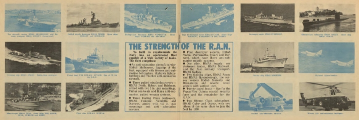 Description: The first editions of Navy Today were published in the early 1960s to provide a snapshot of the contemporary RAN Fleet and a brief commentary on operations in which the RAN was involved. The booklets were distributed by Navy Public Relations and through Navy Recruiting centres around Australia and were produced in various formats until the mid 1990s at which time web-based technology took over.