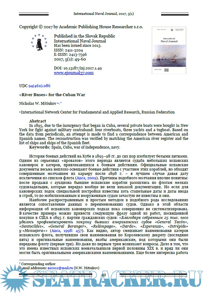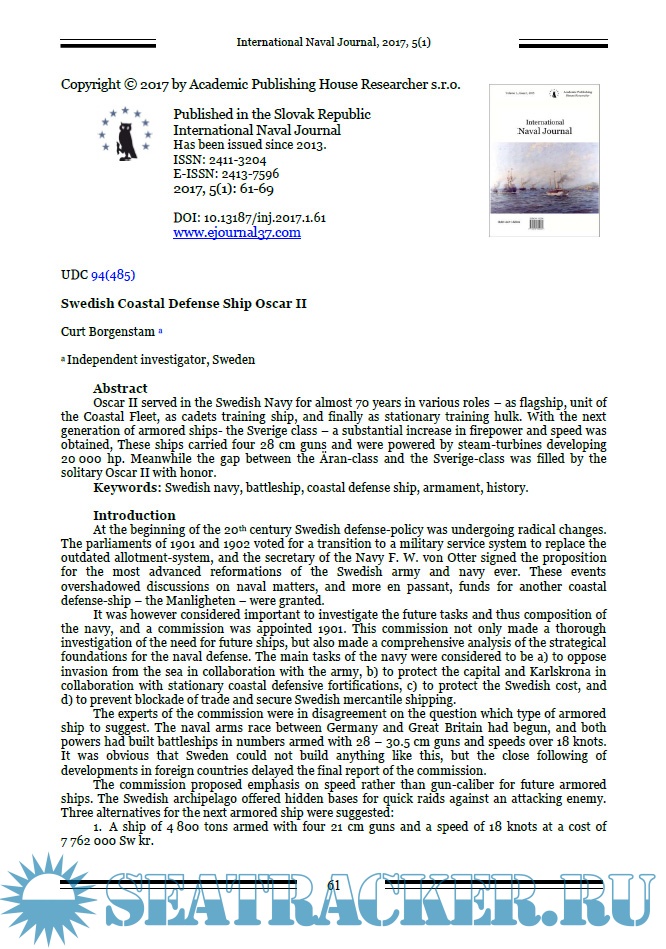 Описание: Миссия журнала заключается в создании международной дискуссионной платформы в области военно-морской истории. В отличие от большинства авторитетных военно-морских исторических журналов, мы позиционируем себя в первую очередь как один из немногих научных журналов в этой области, что предполагает необходимые требования к структурированию работы, ее метаданным, библиографическому описанию, а также процедуре рецензирования.Журнал публикует материалы, статьи и краткие сообщения о результатах исследований в области военно-морской истории, на английском и русском языках. Выходные данные статьи на английском языке.