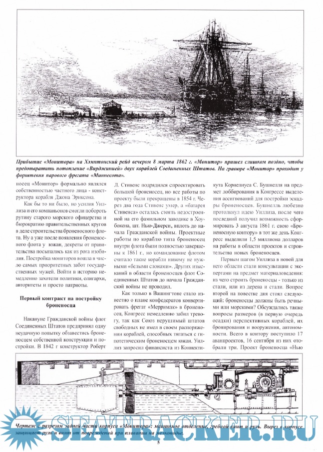 Описание: О том, что “Мерримак” (переименованный вообще-то в “Вирджинию”) и “Монитор” произвели революцию в военном деле знают даже в детских садиках. Все-таки напомним: полдела, что “Монитор” являлся бронированным кораблем, все дело в том, что на бронированный корабль установили впервые в истории башню с артиллерийскими орудиями, а башня могла вращаться в секторе 360 градусов. Первое сражение между броненосцами, известное как “битва при Хэмтон Роадз”, произошла 9 марта 1862 г. Итоги боя привели к повальному увлечению строительством мониторов. Президент США Абрахам Линкольн, будучи человеком неизмеримо от флота далеким, тем не менее заявил, что отныне победу в морской войне смогут принести только “мониторы”. Самый первый монитор под названием “Монитор” дал имя целому классу хорошо бронированных и отменно вооруженных кораблей.