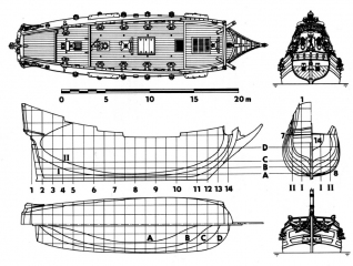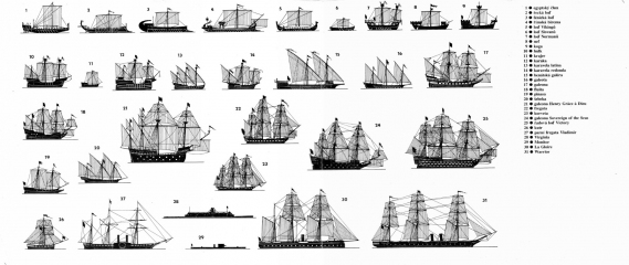Středověké lodě-lodě, coggy, caracchi a karavely. Plachetnice s plnou plachetnicí. Zobrazeny jsou návrhy různých lodí-asi 40 schémat celkového vzhledu, řezy, výzbroj, schéma rangoutu a takeláže plachetnice. mezi nejvýznamnější bitvy patří Salamin, Lepanto, Abukir, Trafalgar, Sinop. Kniha končí vznikem francouzské fregaty Gloir, na které byly použity dvě inovace, které znamenaly začátek nové éry - parní stroj a rezervace na palubě železnými pásy. začalo století páry a brnění.