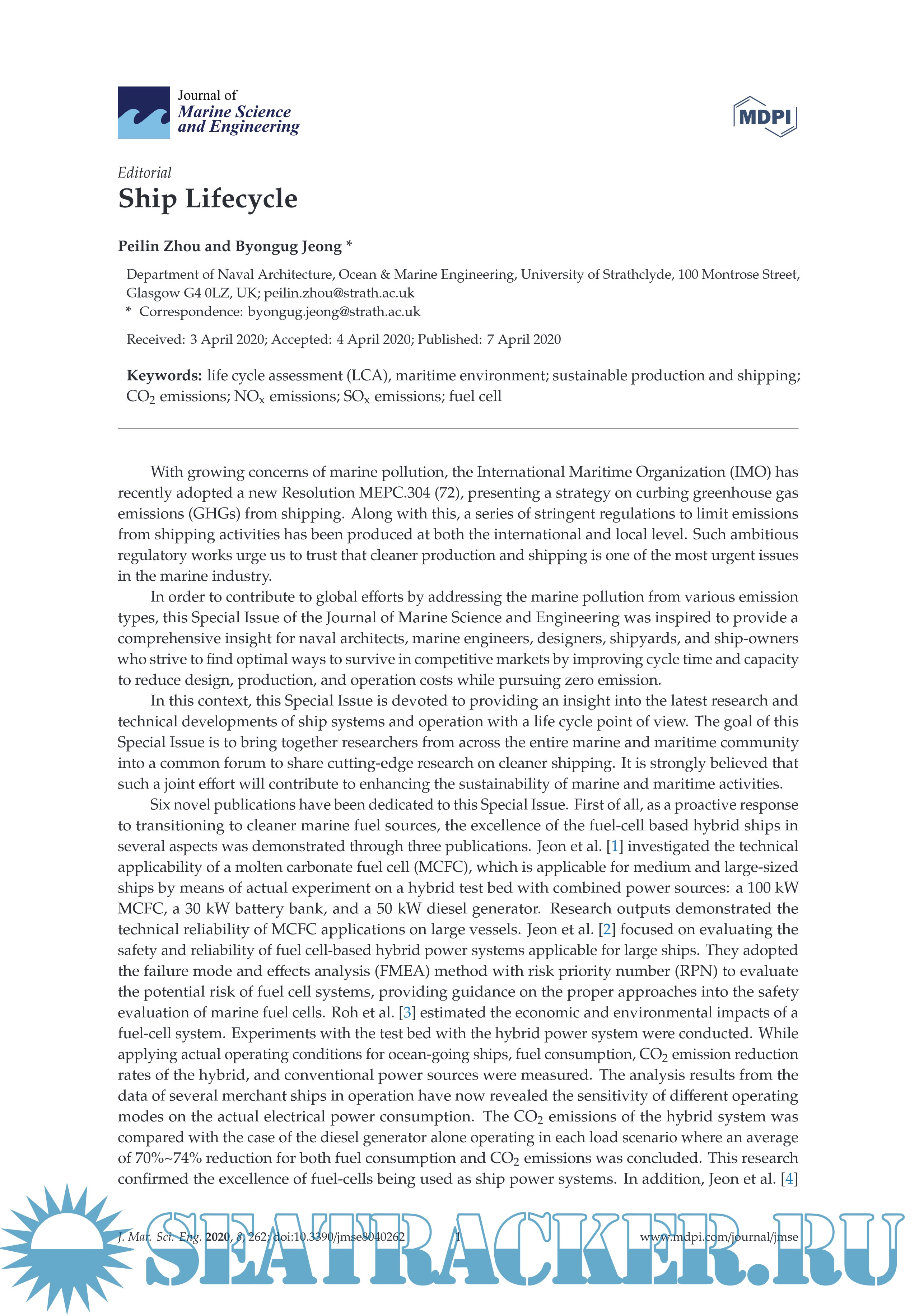 Description: In an effort to contribute to global efforts by addressing the marine pollution from various emission types, this Special Issue of Ship Lifecyle for Journal of Marine Science and Engineering was inspired to provide a comprehensive insight for naval architects, marine engineers, designers, shipyards, and ship-owners who strive to find optimal ways to survive in competitive markets by improving cycle time and the capacity to reduce design, production, and operation costs while pursuing zero emission. In this context, this Special Issue is devoted to providing insights into the latest research and technical developments on ship systems and operation with a life cycle point of view. The goal of this Special Issue is to bring together researchers from the whole marine and maritime community into a common forum to share cutting-edge research on cleaner shipping. It is strongly believed that such a joint effort will contribute to enhancing the sustainability of the marine and maritime activities. This Special Issue features six novel publications dedicated to this endeavor. First of all, as a proactive response to transitioning to cleaner marine fuel sources, numerous aspects of the excellence of fuel-cell based hybrid ships were demonstrated through four publications. In addition, two publications demonstrated the effectiveness of life cycle assessment (LCA) applicable to marine vessels.