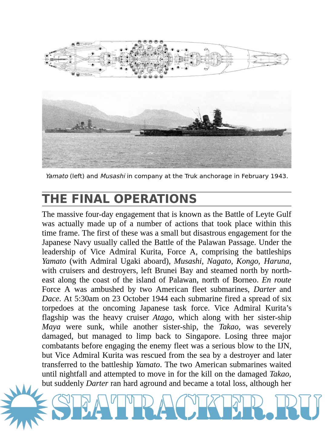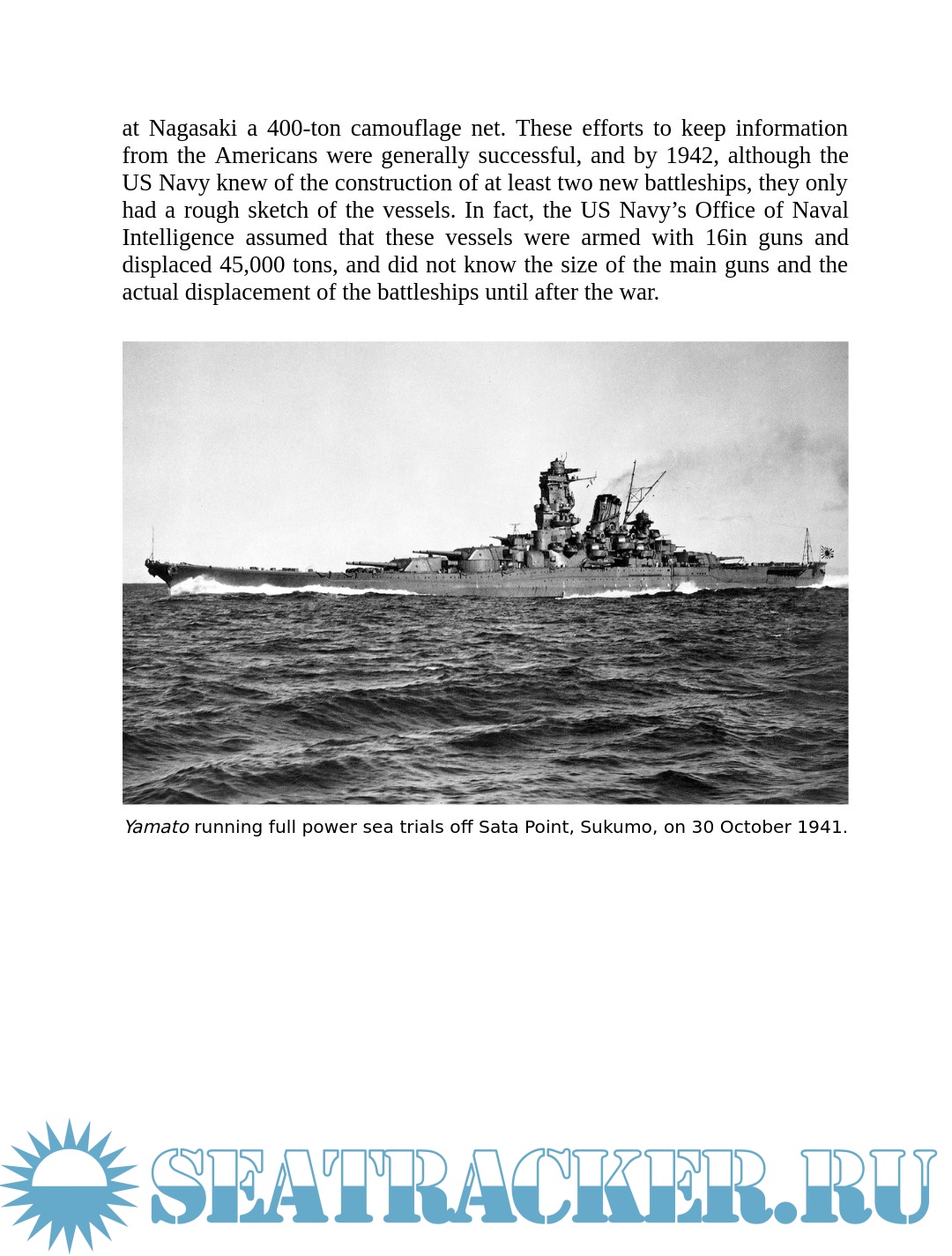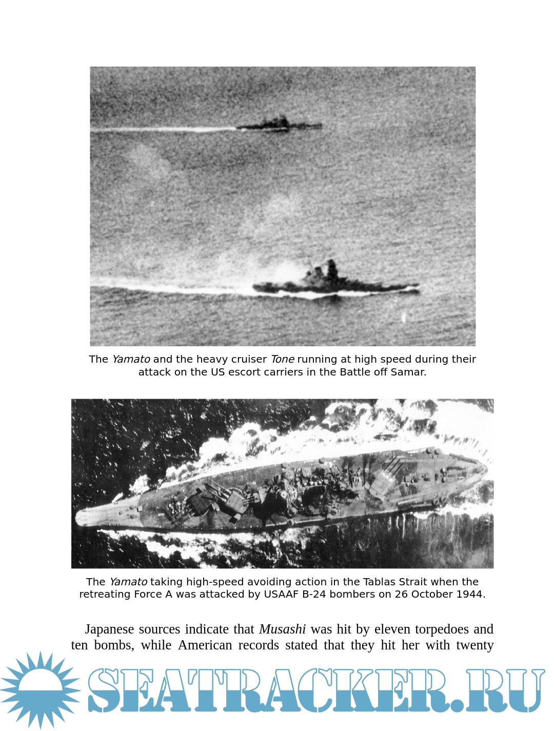 The Yamato class battleships of the Imperial Japanese Navy were the largest warships of the Second World War and the largest battleships ever constructed, displacing 78,800 tons. They also carried the largest naval artillery ever fitted to a warship - 18in guns. Neither Yamato nor her sistership Musashi made much impact on the War. Musashi was sunk during the battle of Leyte Gulf while Yamato, deployed in a deliberate suicide attack on Allied forces at the battle of Okinawa, was finally sunk by US carrier-based aircraft; Not 300 of her 3,330 crew survived.