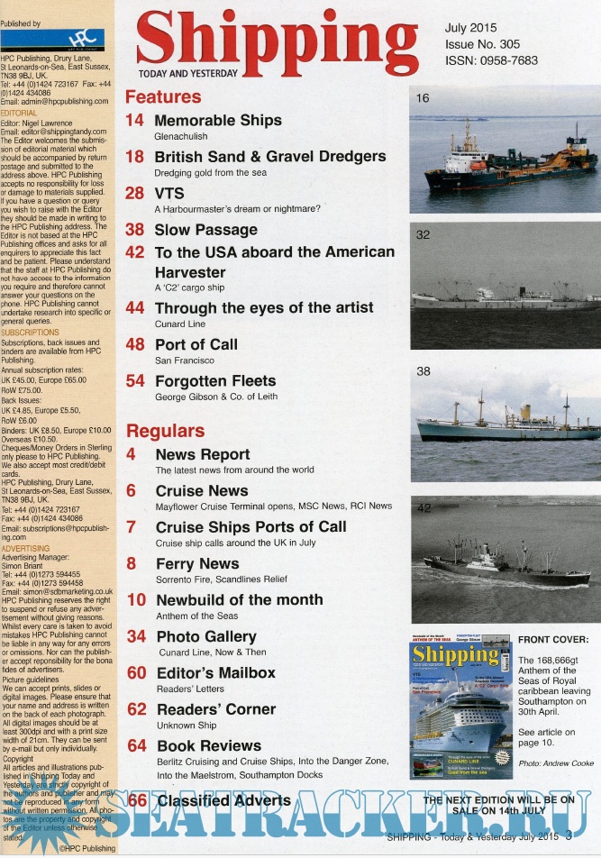 Year: 2015 Language: English Author: Nigel Lawrence (Editor) Genre: Periodical publication Edition: 2015-07 Format: PDF Quality: Scanned pages Pages count: 66 Description: Shipping T&Y is a monthly magazine for the shipping enthusiast offering up-to-date information, topical and in-depth historical articles alongside images, many of which are exclusive to the magazine.Shipping Today & Yesterday is a specialist magazine for the shipping enthusiast offering up-to-date information, topical and in-depth historical articles.Shipping Today & Yesterday was first produced in March 1990 by, the then Editor and Publisher, John Young. The first edition stated that it would, “offer a news service covering important developments in the Shipping industry Today and will look back at ships and events of Yesterday, with regular features on merchant ships