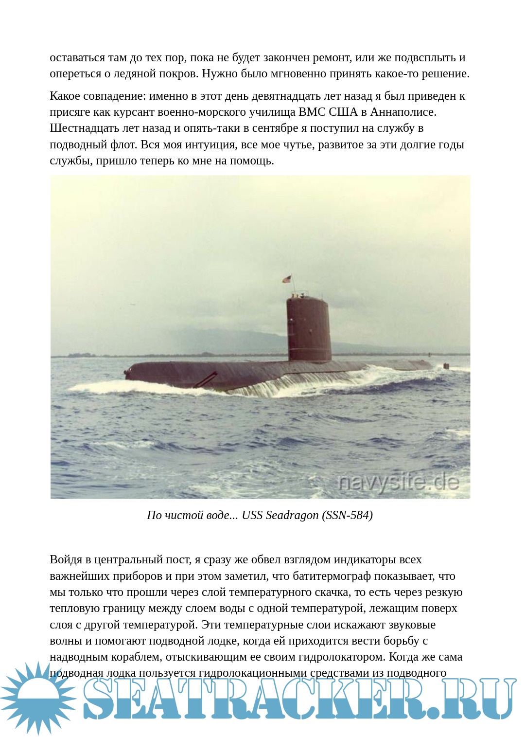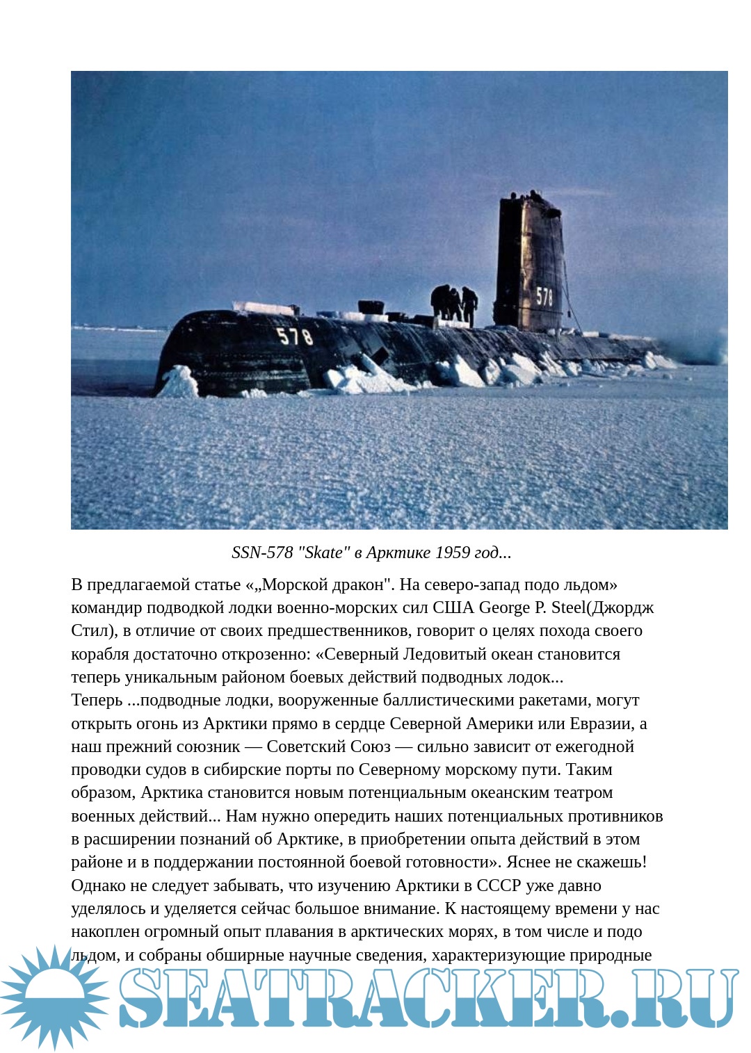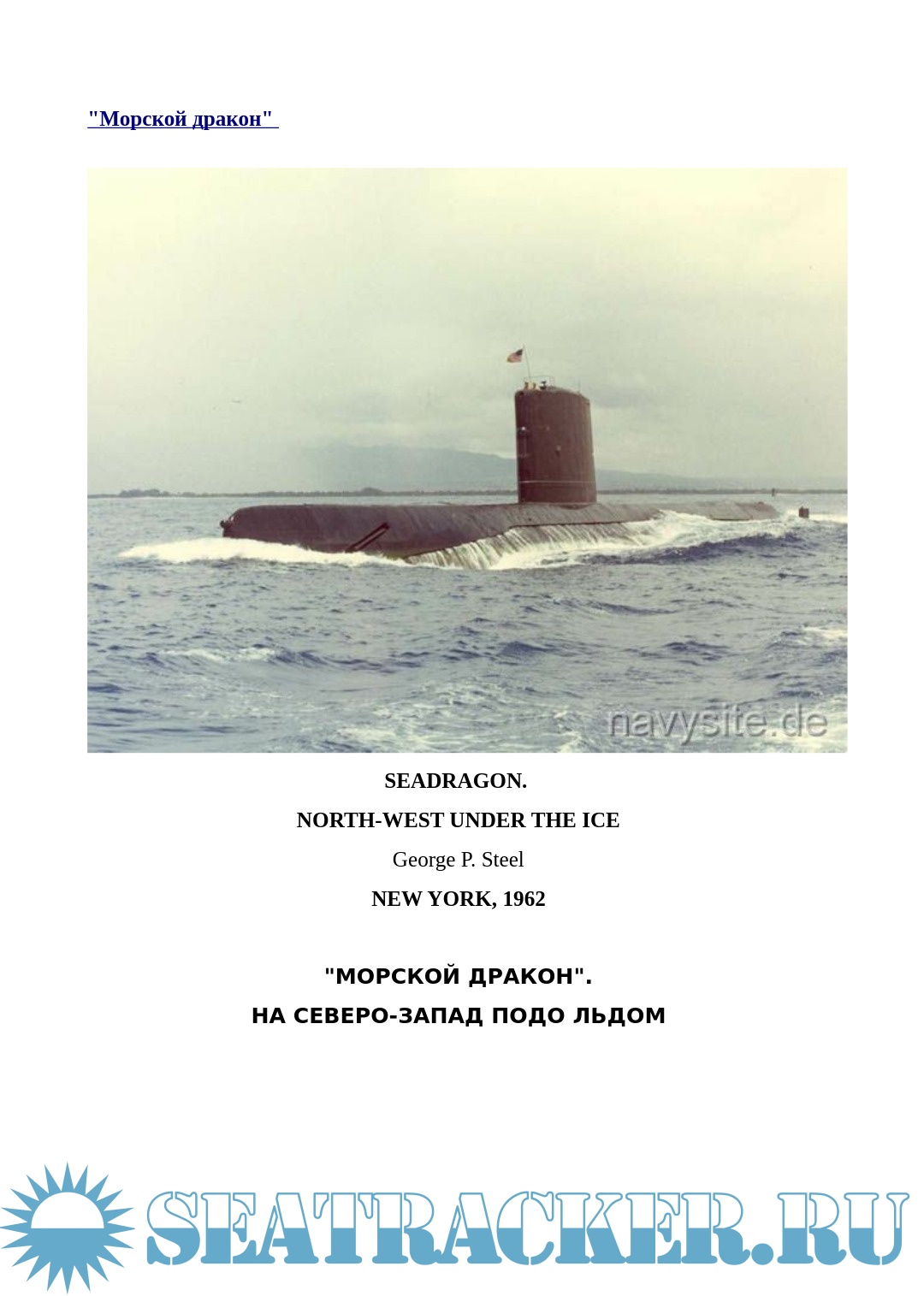 Описание: В предлагаемой статье «„Морской дракон". На северо-запад подо льдом» командир подводкой лодки военно-морских сил США George P. Steel(Джордж Стил), в отличие от своих предшественников, говорит о целях похода своего корабля достаточно откровенно: «Северный Ледовитый океан становится теперь уникальным районом боевых действий подводных лодок... Теперь ...подводные лодки, вооруженные баллистическими ракетами, могут открыть огонь из Арктики прямо в сердце Северной Америки или Евразии, а наш прежний союзник — Советский Союз — сильно зависит от ежегодной проводки судов в сибирские порты по Северному морскому пути. Таким образом, Арктика становится новым потенциальным океанским театром военных действий... Нам нужно опередить наших потенциальных противников в расширении познаний об Арктике, в приобретении опыта действий в этом районе и в поддержании постоянной боевой готовности».