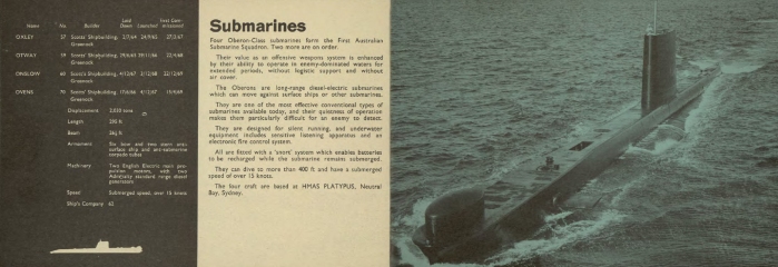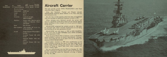 Year: 1971 Language: English Author: Kenmure Genre: Periodical publication Format: PDF Quality: Scanned pages Pages count: 18 Description: The first editions of Navy Today were published in the early 1960s to provide a snapshot of the contemporary RAN Fleet and a brief commentary on operations in which the RAN was involved. The booklets were distributed by Navy Public Relations and through Navy Recruiting centres around Australia and were produced in various formats until the mid 1990s at which time web-based technology took over.