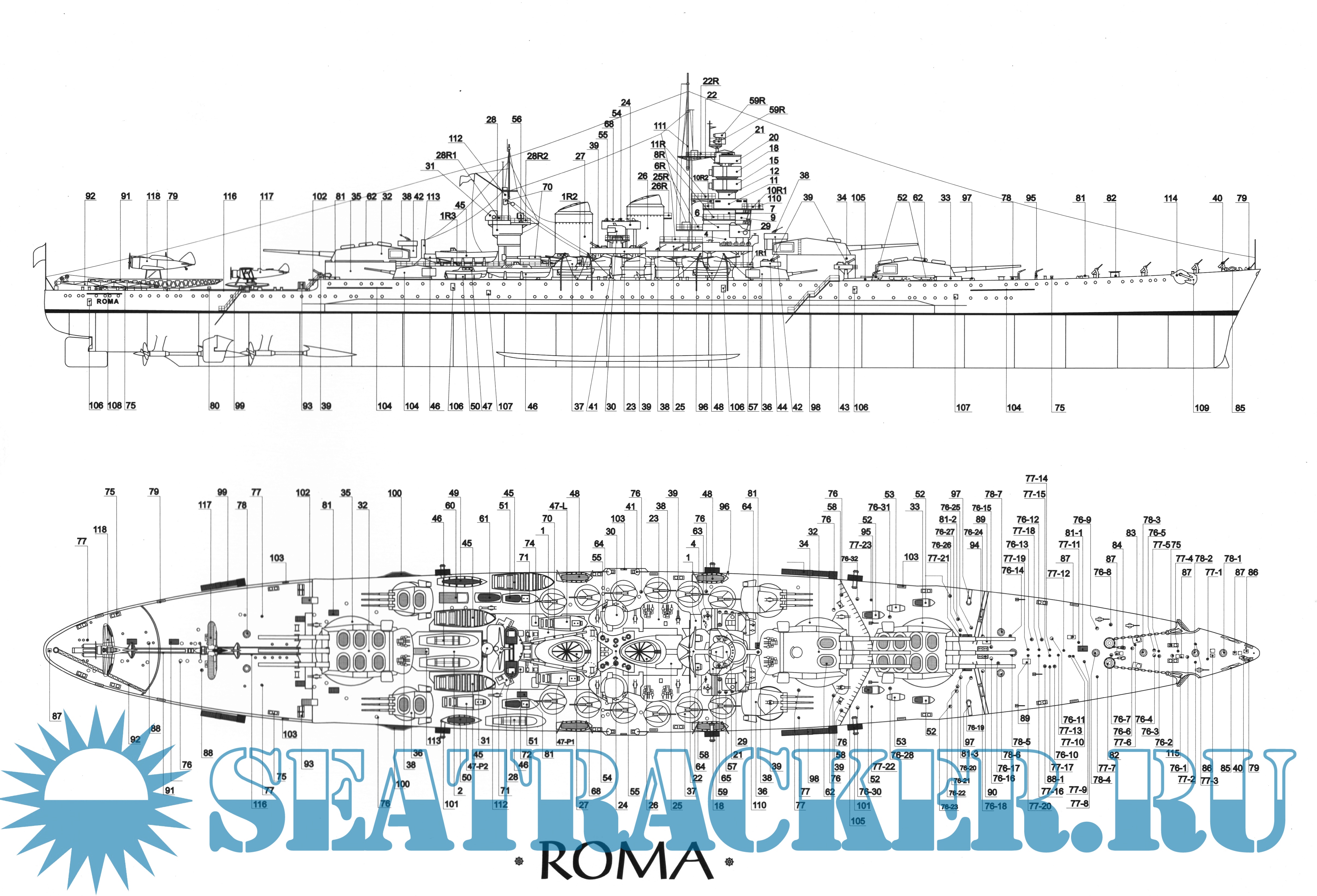 28 листов цветных выкроек и инструкций для изготовления бумажной модели итальянского линкора ''Roma'' в масштабе 1:200Скриншоты