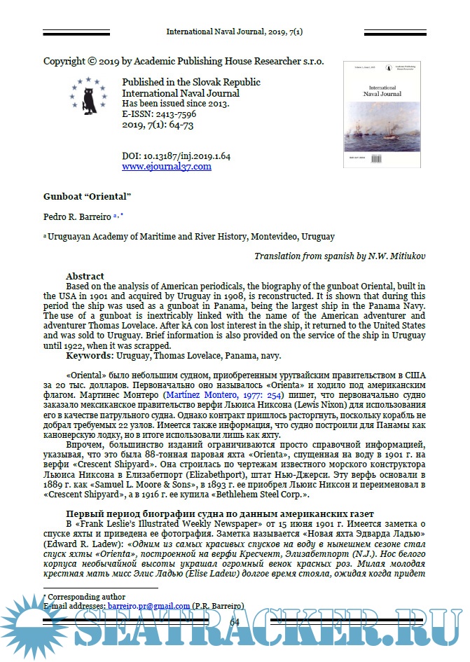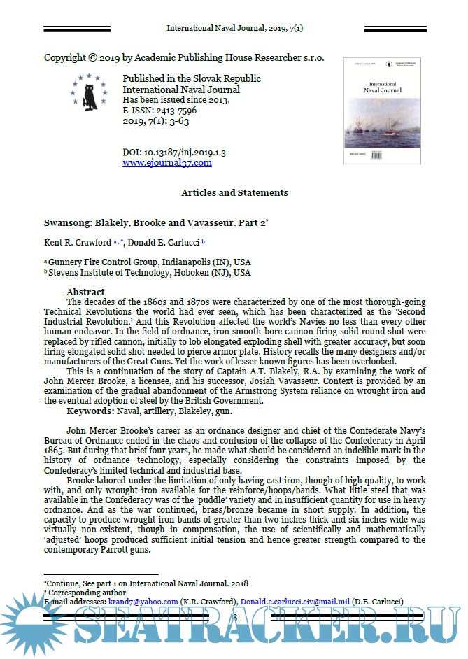 Описание: Миссия журнала заключается в создании международной дискуссионной платформы в области военно-морской истории. В отличие от большинства авторитетных военно-морских исторических журналов, мы позиционируем себя в первую очередь как один из немногих научных журналов в этой области, что предполагает необходимые требования к структурированию работы, ее метаданным, библиографическому описанию, а также процедуре рецензирования.Журнал публикует материалы, статьи и краткие сообщения о результатах исследований в области военно-морской истории, на английском и русском языках. Выходные данные статьи на английском языке.