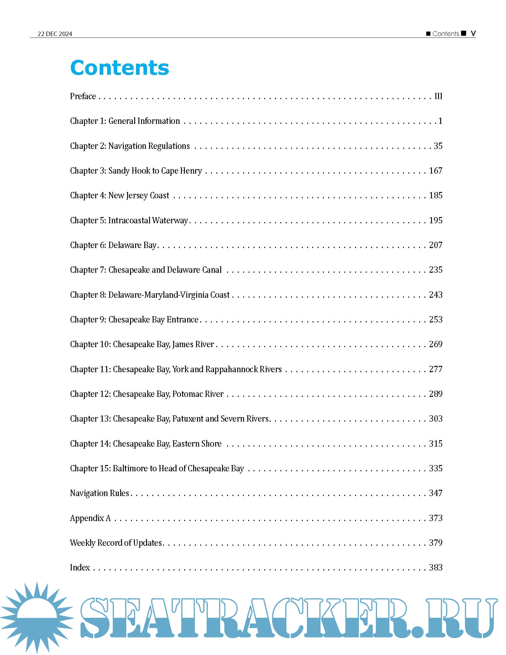 Topics in the Coast Pilot include channel descriptions, anchorages, bridge and cable clearances, currents, tide and water levels, prominent features, pilotage, towage, weather, ice conditions, wharf descriptions, dangers, routes, traffic separation schemes, small craft facilities, and Federal regulations applicable to navigation.