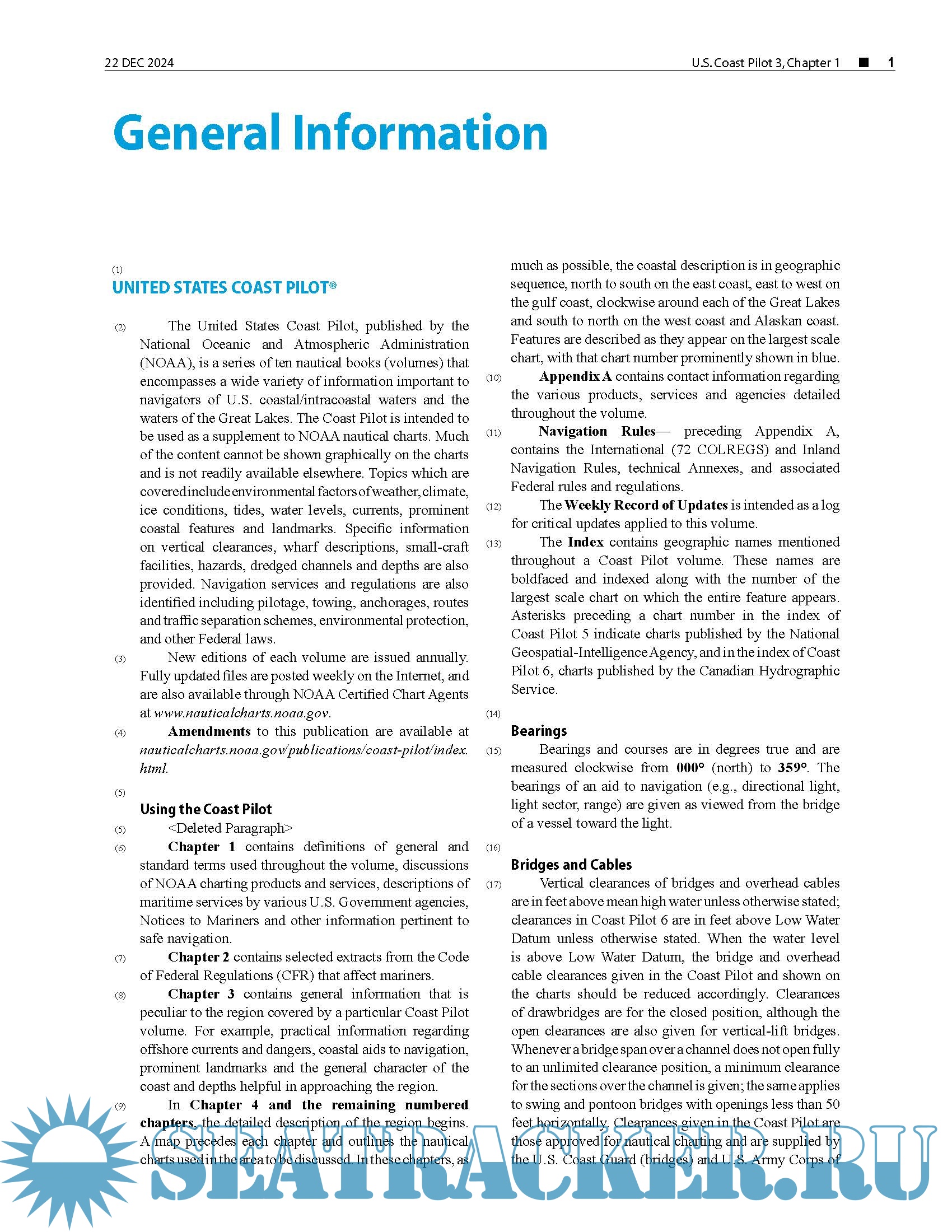 Description: The United States Coast Pilot® supplements the navigational information shown on NOAA nautical charts. The publication is continually updated and maintained from inspections conducted by NOAA survey vessels and field parties, corrections published in Notices to Mariners, information from other Federal agencies, State and local governments, maritime and pilots’ associations, port authorities, and concerned mariners.