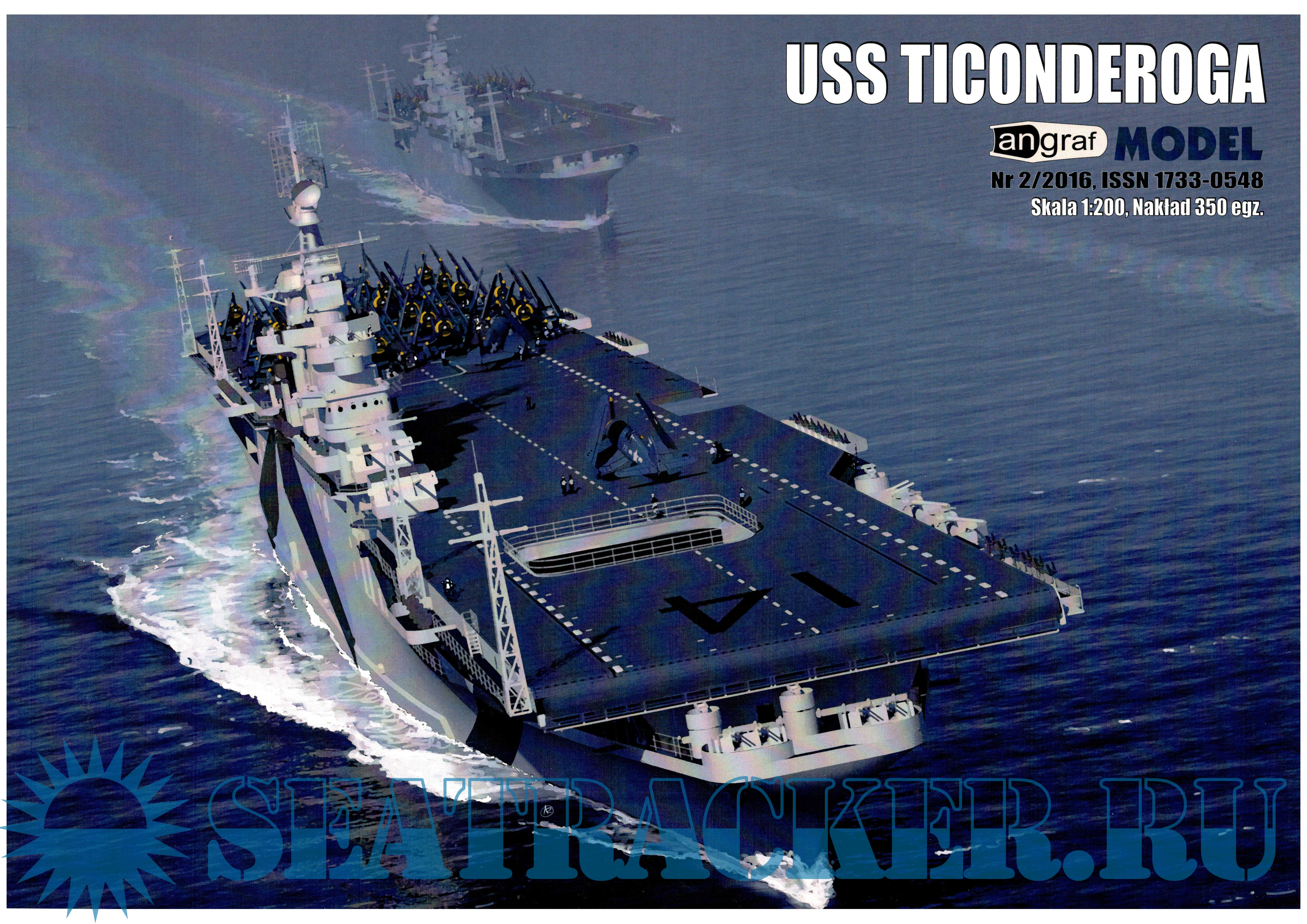 48 листов цветных выкроек и инструкций для изготовления бумажной модели авианосца США USS Ticonderog в масштабе 1:200