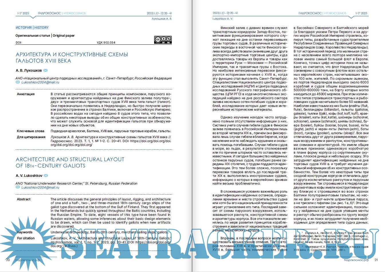 Описание: Научный журнал «Гидрокосмос» — первое в России междисциплинарное издание о подводных исследованиях. Он задуман как площадка для обсуждения научных проблем изучения свидетельств взаимодействия людей с морями, озерами и реками, исследованиям смежных занятий и ремесел, а также ныне затопленных участков суши. В повестку издания входят теоретические и методологические вопросы подводных исследований; проблемы морской археологии, связанные с консервацией и реставрацией предметов, обнаруженных в воде; вопросы сохранности объектов культурного наследия; вопросы технического, медицинского, организационного и юридического обеспечения подводных археологических работ. Журнал «Гидрокосмос» создан как инструмент для укрепления сообщества теоретиков и практиков подводных исследований, для обеспечения синергии в дальнейшем развитии отрасли в России.