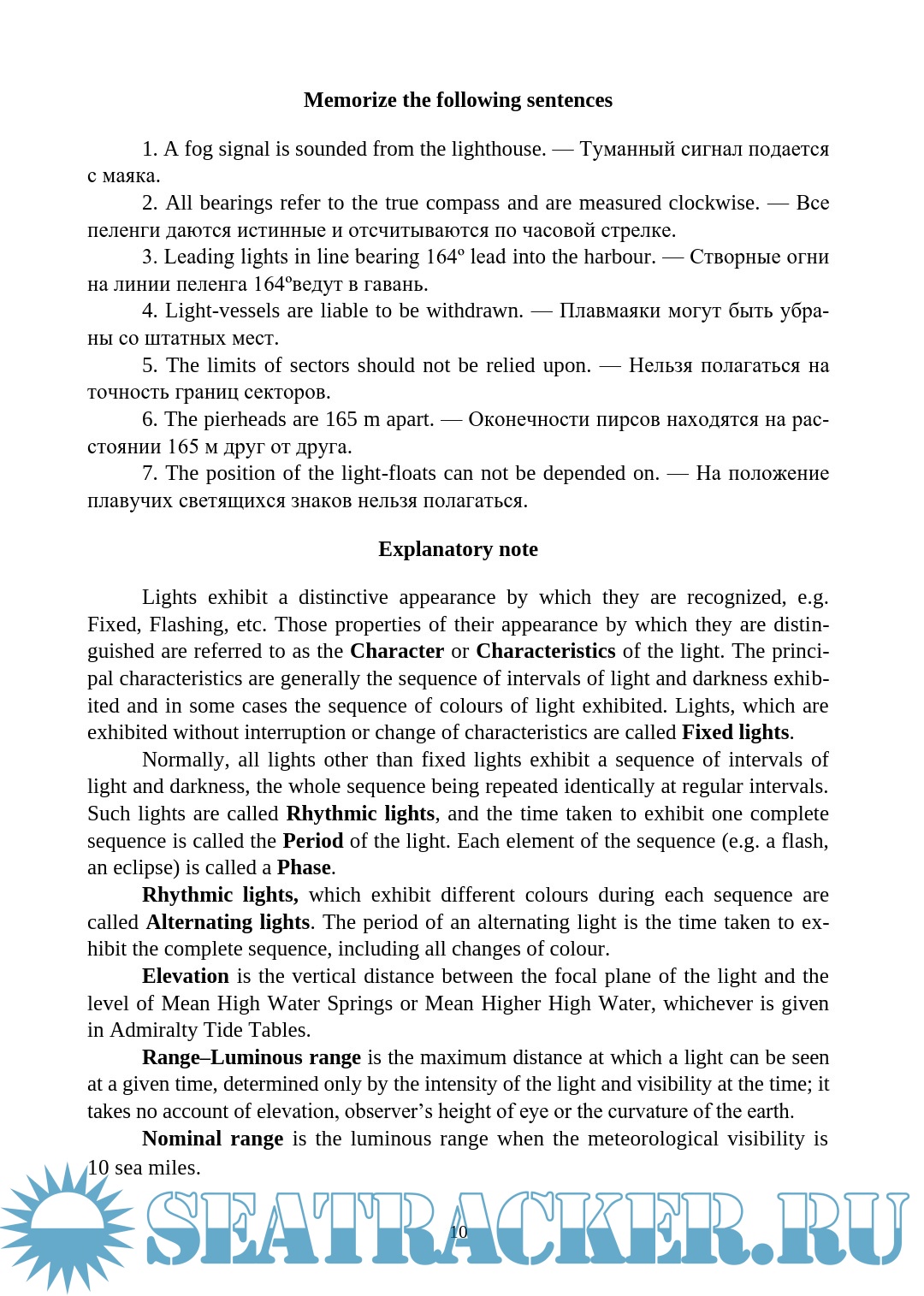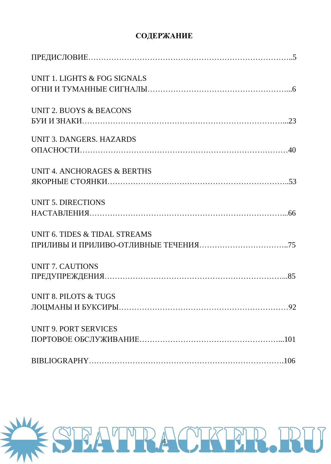 Description: Учебное пособие содержит профессиональную лексику и фразы, знание которых помогает читать и понимать навигационные публикации, в частности, лоции, а также упражнения и задания, направленные на развитие профессионально-коммуникативных навыков. Подготовлено с учетом требований Федерального государственного образовательного стандарта высшего образования. Учебное пособие предназначено для студентов, обучающихся по специальности 26.05.05 «Судовождение», изучающих дисциплину «Иностранный язык (английский)».