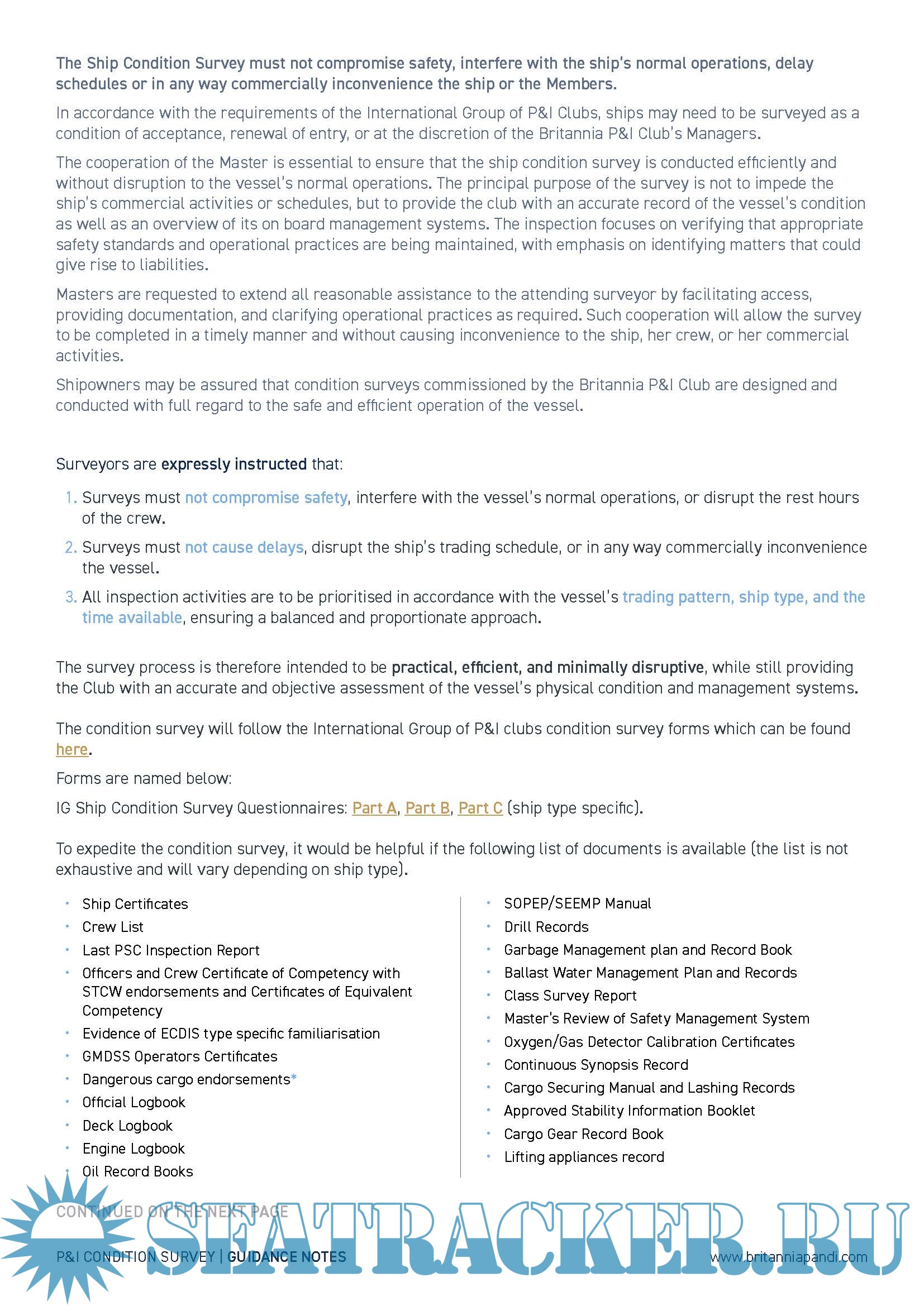 Description: Britannia P&I has released updated Guidance Notes on the IG Ship Condition Survey Report Forms, now available for both surveyors and masters.