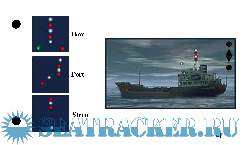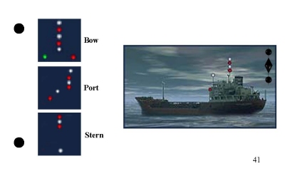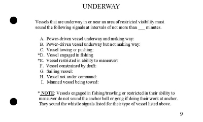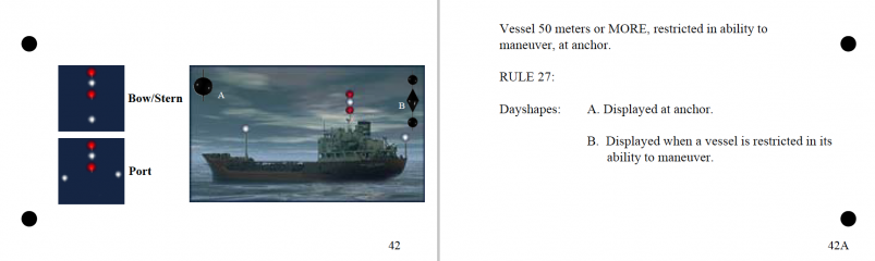 A deck of flashcards depicting the 62 rules of the road relevant to the rules portion of the U. S. Coast Guard license exams. Answers on the back of each card. Covers lights, shapes, steering rules, signals.