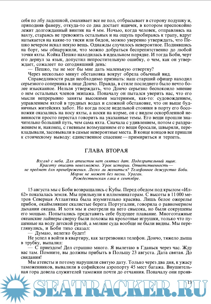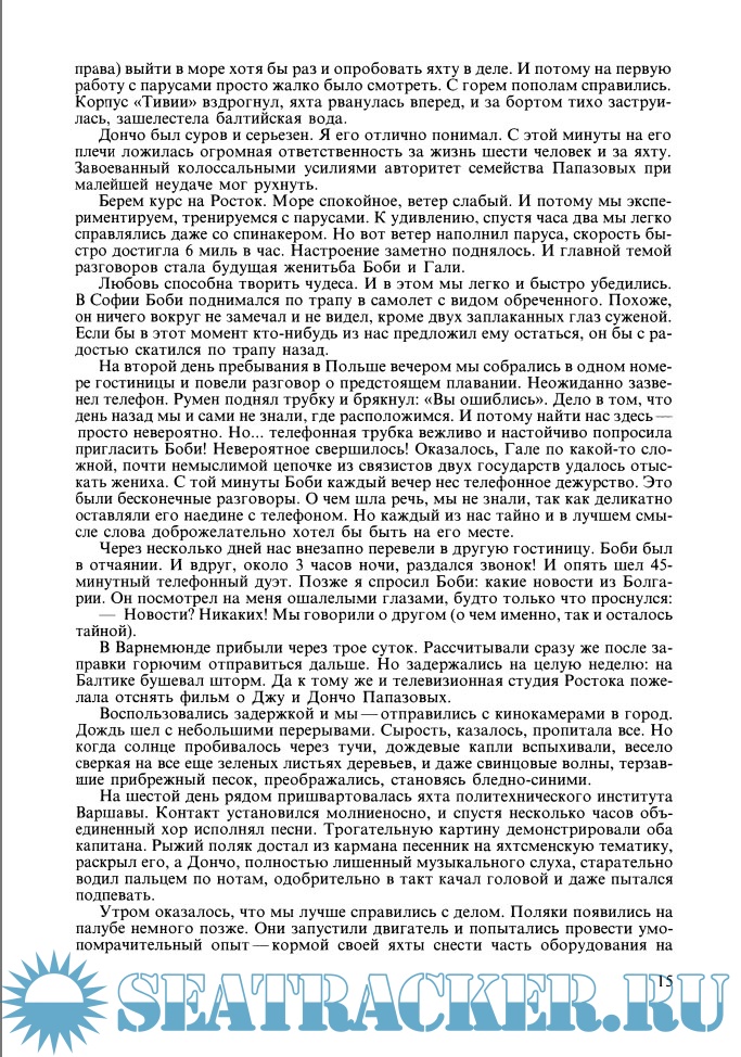 Год выпуска: 1993 Язык: Русский Автор: Папазова Ю., Папазов Д., Идакиев С. Жанр: Путешествия Формат: PDF Качество: Отсканированные страницы Количество страниц: 422 Описание: Известные болгарские путешественники Ю. Папазова и Д. Папазов рассказывают о своем кругосветном плавании на яхте «Тивия». В книге описывается также тренировочное плавание вокруг Западной Европы (из Польши, где была построена яхта, в Болгарию), предшествовавшее кругосветному путешествию (это часть книги написана С. Идакиевым)