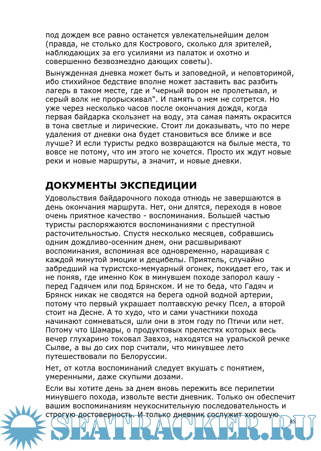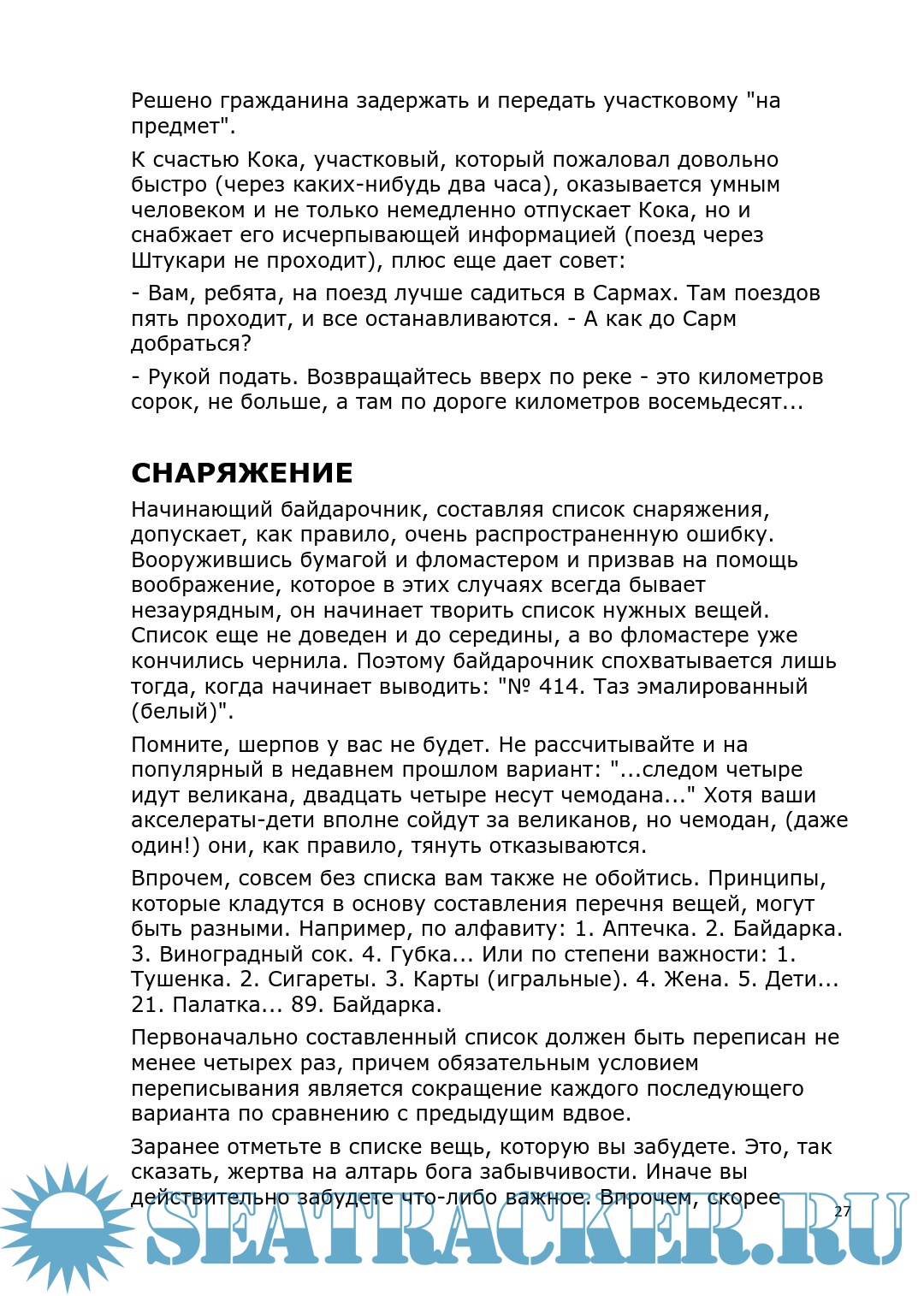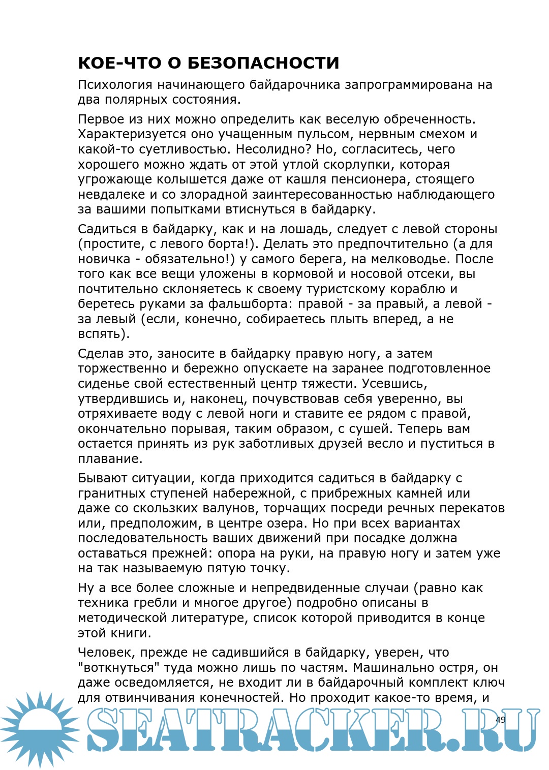 Описание: В книге непринужденно и с юмором рассказывается о приобщении к водному туризму и его особенностях. Читатель найдет в ней полезные сведения о выборе маршрута, организации похода на байдарке, комплектовании снаряжения, узнает о подстерегающих туриста опасностях.