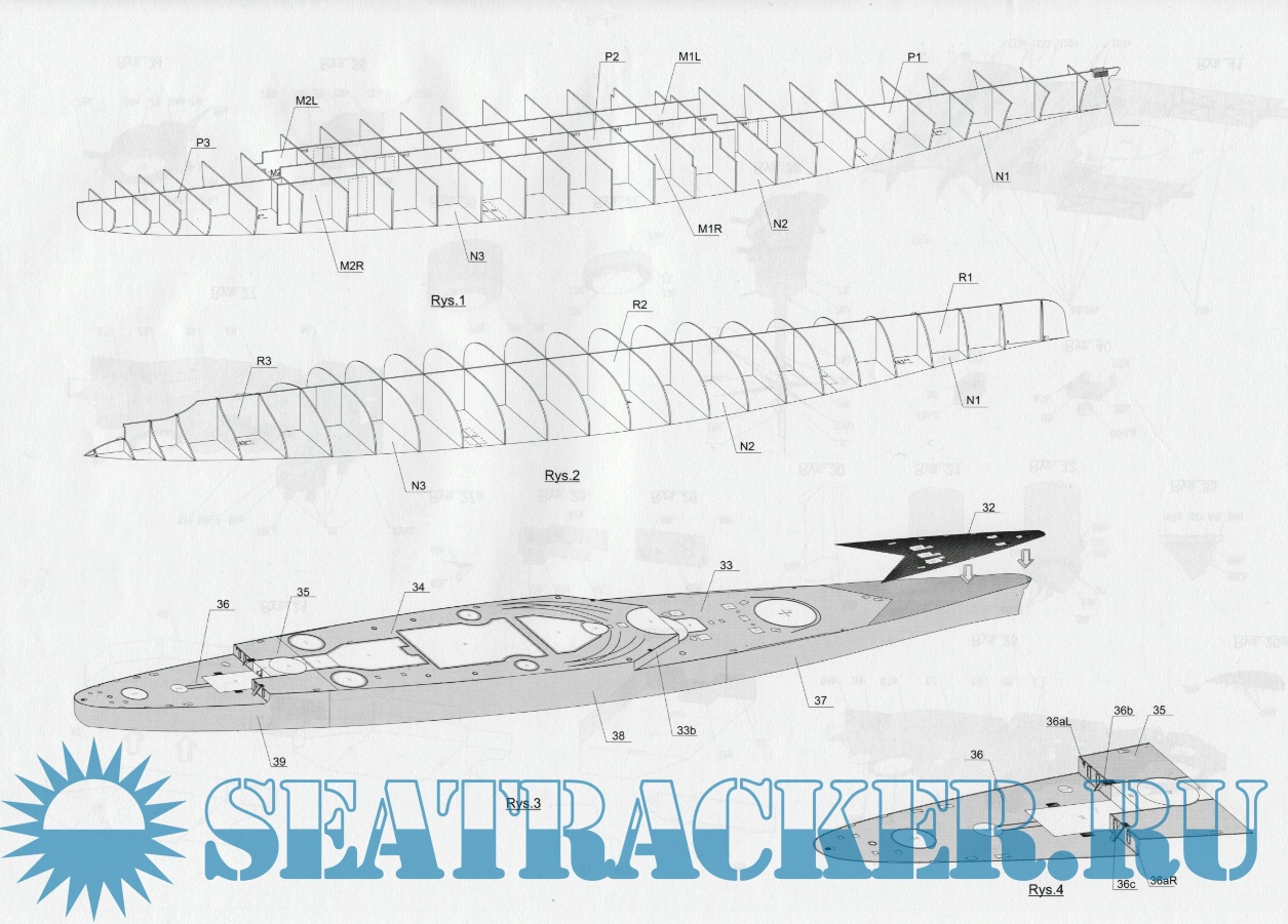 30 листов цветных выкроек и инструкций для изготовления бумажной модели французского линкора Dunkerque в масштабе 1:200