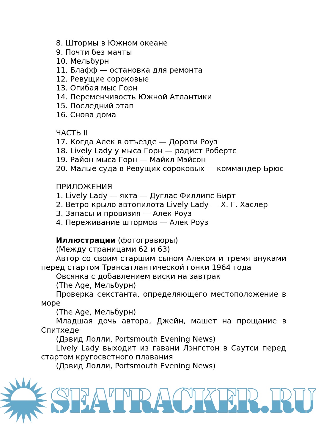 Год выпуска: 1969 Язык: Русский Автор: Роуз А. Жанр: История Издательство: Pan Books Ltd Формат: PDF, ePUB, FB2 Качество: Изначально компьютерное (eBook) Количество страниц: 232 Описание: Перевод любительский. - С оригинала: My 'Lively Lady'. London: Pan Books Ltd. 1969. – 220 p. Роуз Алек (Rose Alec, Sir) (1908-1991) - был английским торговцем фруктами, который после службы в Королевском флоте во время Второй мировой войны увлекся любительским одиночным парусным спортом. Учасник второй трансатлантической гонки одиночек 1964 года на яхте Lively Lady. На ней же он совершил кругосветное путешествие через мысы Доброй Надежды и Горн всего с двумя остановками в 1967-68 годах, вторым после Френсиса Чичестера и был посвящен в рыцари королевой. Об этих плаваниях и повествует его книга.