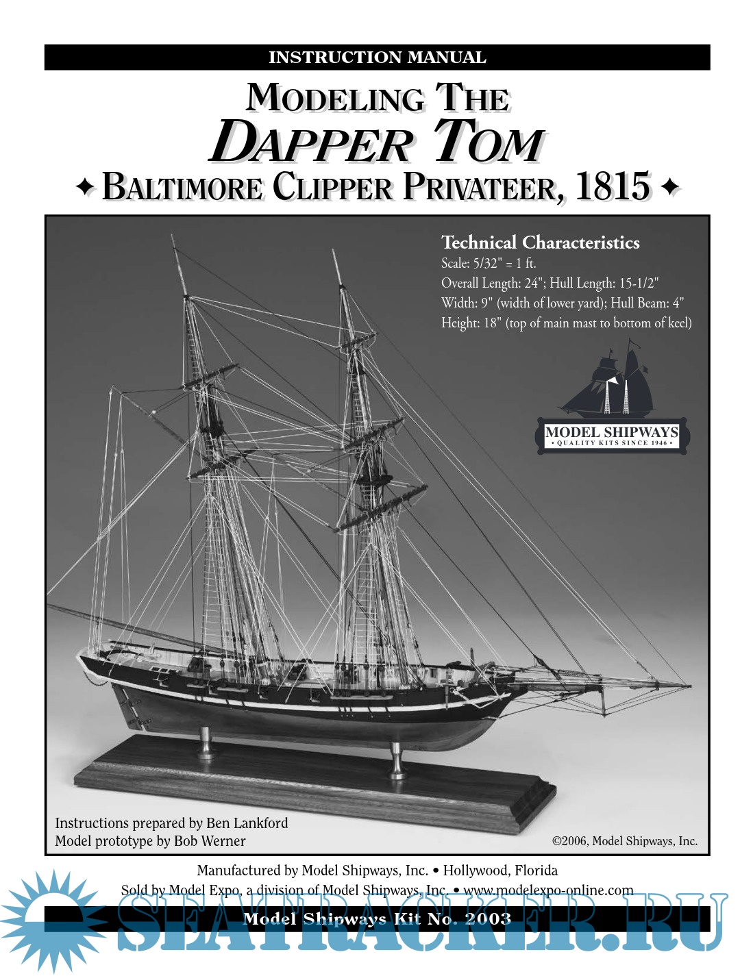 Year: 2006 Language: English Author: Lankford B. Publisher: Model Shipways Format: PDF Quality: eBook Pages count: 24 Description: The Dapper Tom, an 8-gun topsail schooner, is to great extent, typical of Baltimore Privateers during a time when ships were at the mercy of any stranger, and even armed ships were safe only in proportion to their nimbleness. Historically accurate and perfectly scaled. Machine carved basswood hull reduces building time. Eight cast metal cannon replicate the original 9-pounders. Fittings are now cast from lead-free Brittania metal and some laser-cut wood parts added. Made in the USA. Model Expo is an American manufacturer serving hobby enthusiasts with precision models since 1976 and is a hobby tools manufacturer, distributor, and reseller. Detailed plans and clear assembly instructions. Includes full size actual blueprint. Model Shipways' kits are the most authentic representation available. And now, thanks to newly drawn plans and revised instruction books by Ben Lankford, building our kits is more accurate and easier than ever.