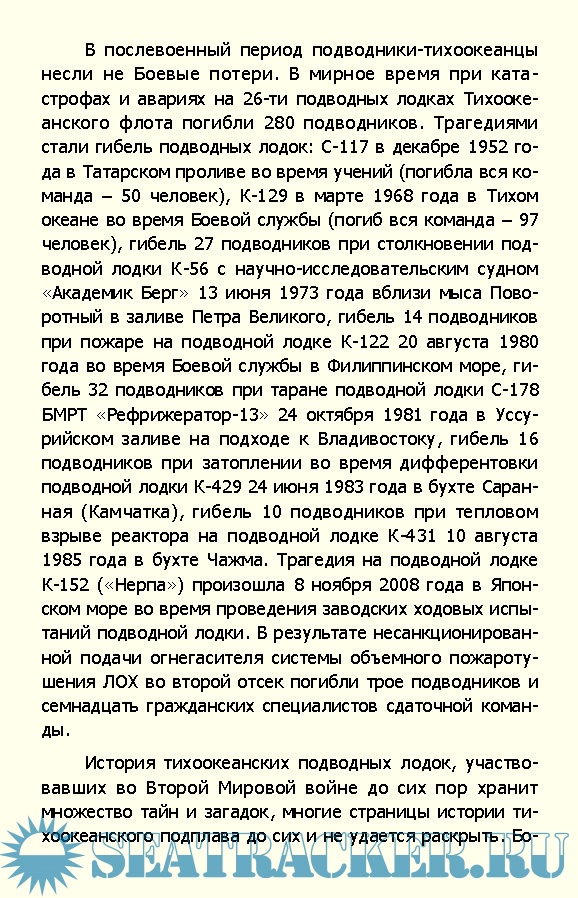 Описание: Долгое время о погибших подводных лодках и подводниках либо упоминалось вскользь, либо не говорилось вообще. До сих пор не известны широкой общественности подвиги этих героев мирного времени. На страницах книги приводятся данные по авариям, которые привели к гибели подводных лодок и гибели подводников ТОФ. Указаны случаи как аварийного, так и боевого характера. Приведенные данные не претендуют на полноту и абсолютную достоверность, поскольку получены из анализа открытых и небольших архивных источников. Книга написана по материалам отечественной и иностранной литературы, проектной документации подводных лодок, очеркам по истории конструкторских бюро и подводных лодок, справочной и мемуарной литературе, журнальным статьям и др. Использована информация из Центрального военно-морского музея России, иностранных военных музеев и мемориалов. В «Трагедиях Тихоокеанского Подплава» также приведены фотографии погибших подводных лодок и фотографии мемориалов и памятников подводным лодкам, которые увековечивают боевые успехи, мужество и отвагу подводников в борьбе с противником и ставшие памятниками подводникам, погибшим при их испытаниях и эксплуатации.